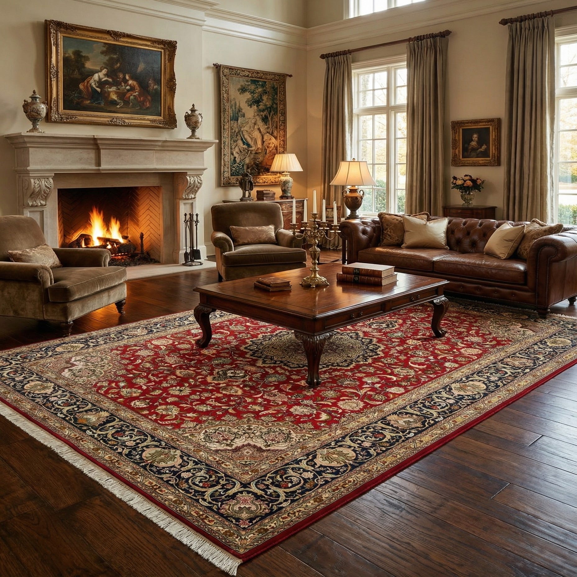 Primary color is Red. Colors in this rug include: Red, Red, Dark Blue, Brown, Olive, Grey, Blue, Cream.