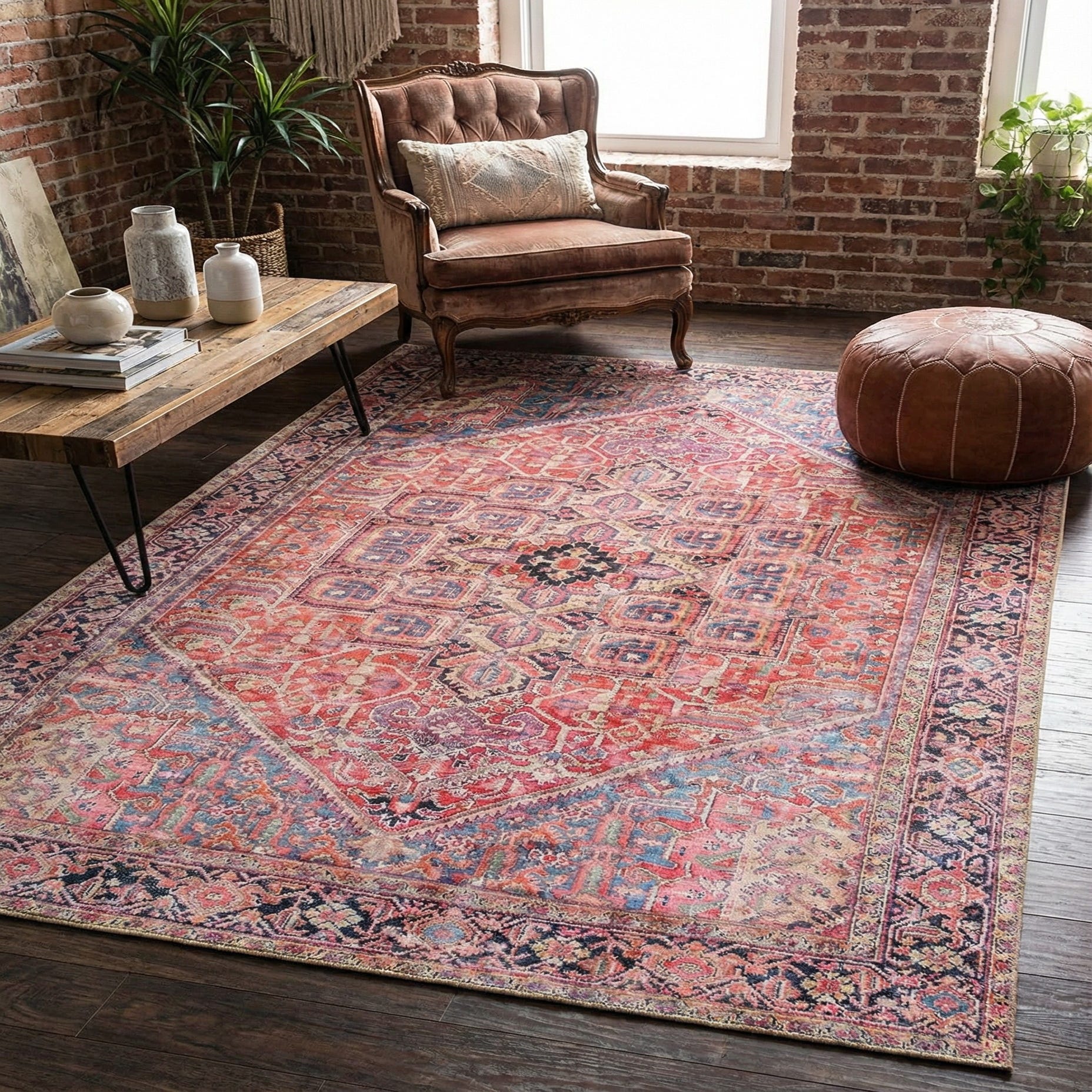 Primary color is Red. Colors in this rug include: Red, Beige, Blue, Brown, Gold, Green, Violet, Navy Blue.