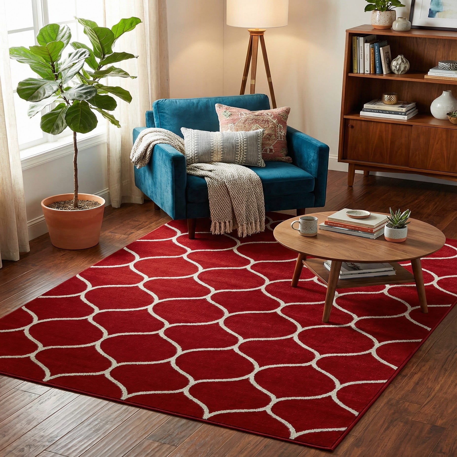 Primary color is Red. Colors in this rug include: Red, Ivory.