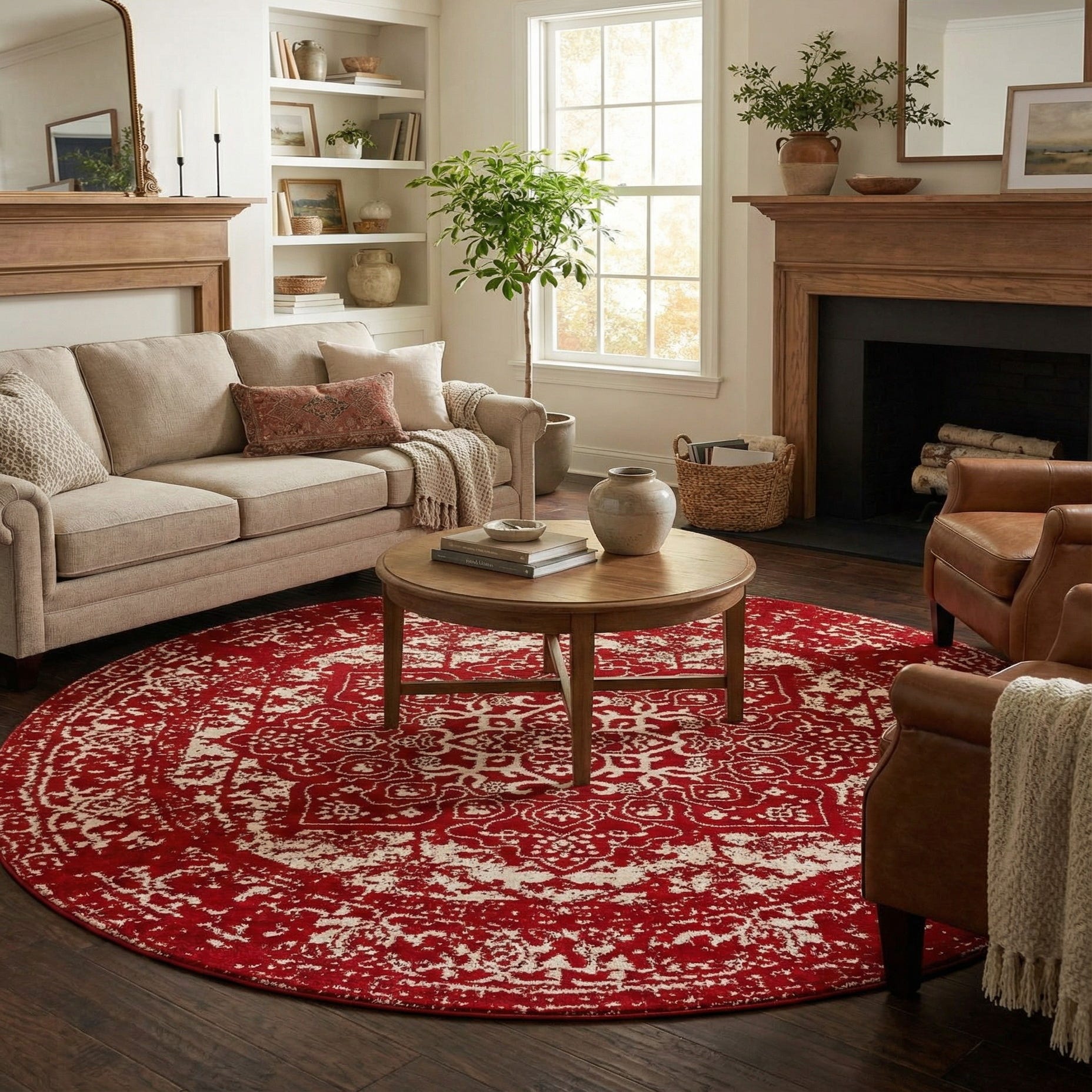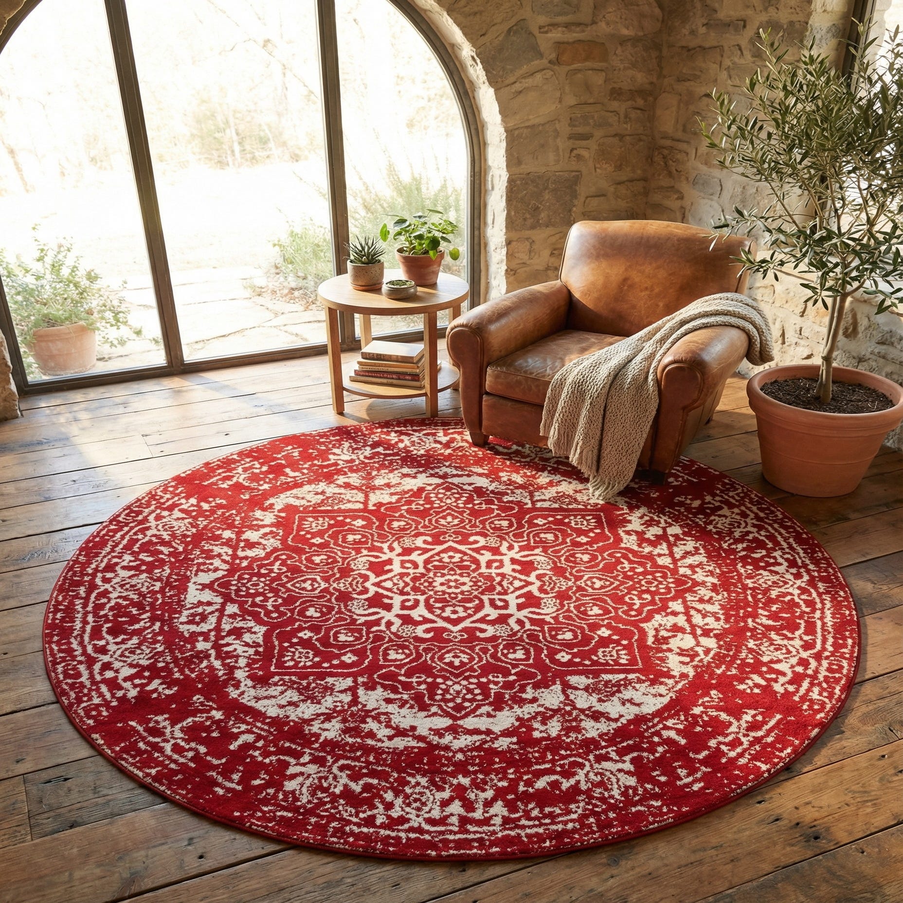 Primary color is Red. Colors in this rug include: Red, Ivory.