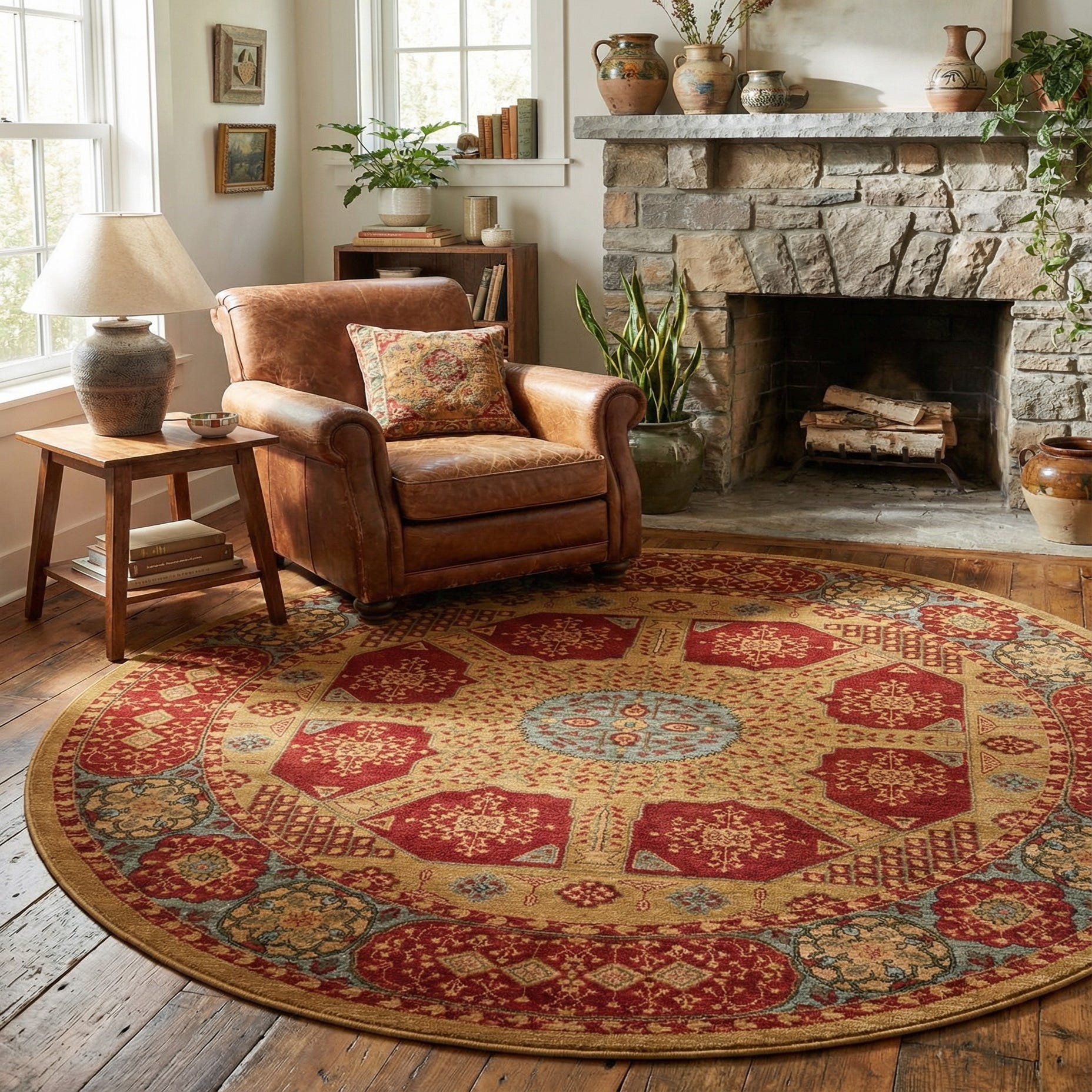 Primary color is Red. Colors in this rug include: Red, Light Blue, Light Brown, Light Green, Olive, Tan, Beige.