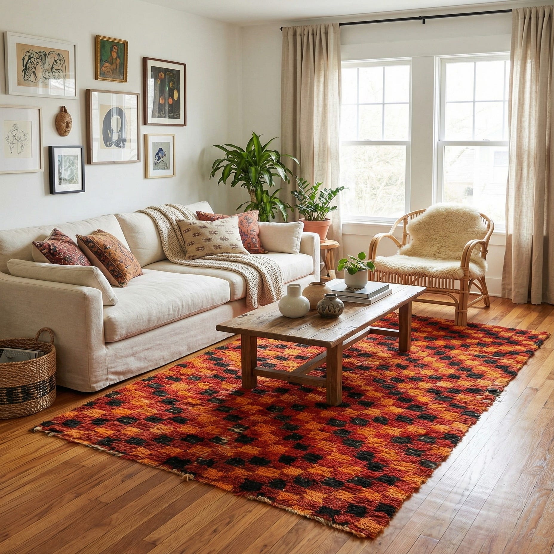 Primary color is Red. Colors in this rug include: Red, Black, Orange.