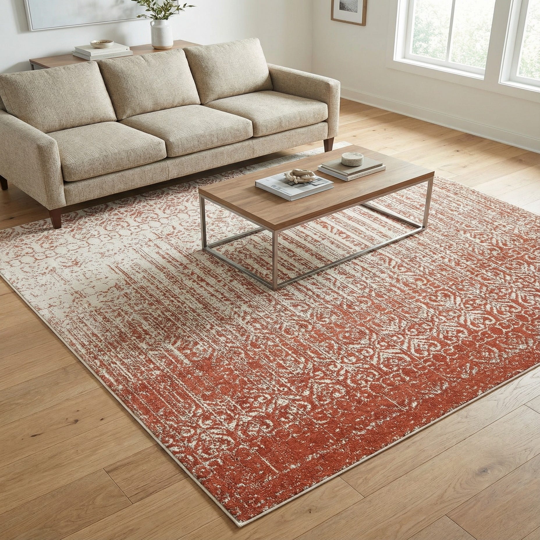 Primary color is Red. Colors in this rug include: Red, Beige, Terracotta, Light Brown.