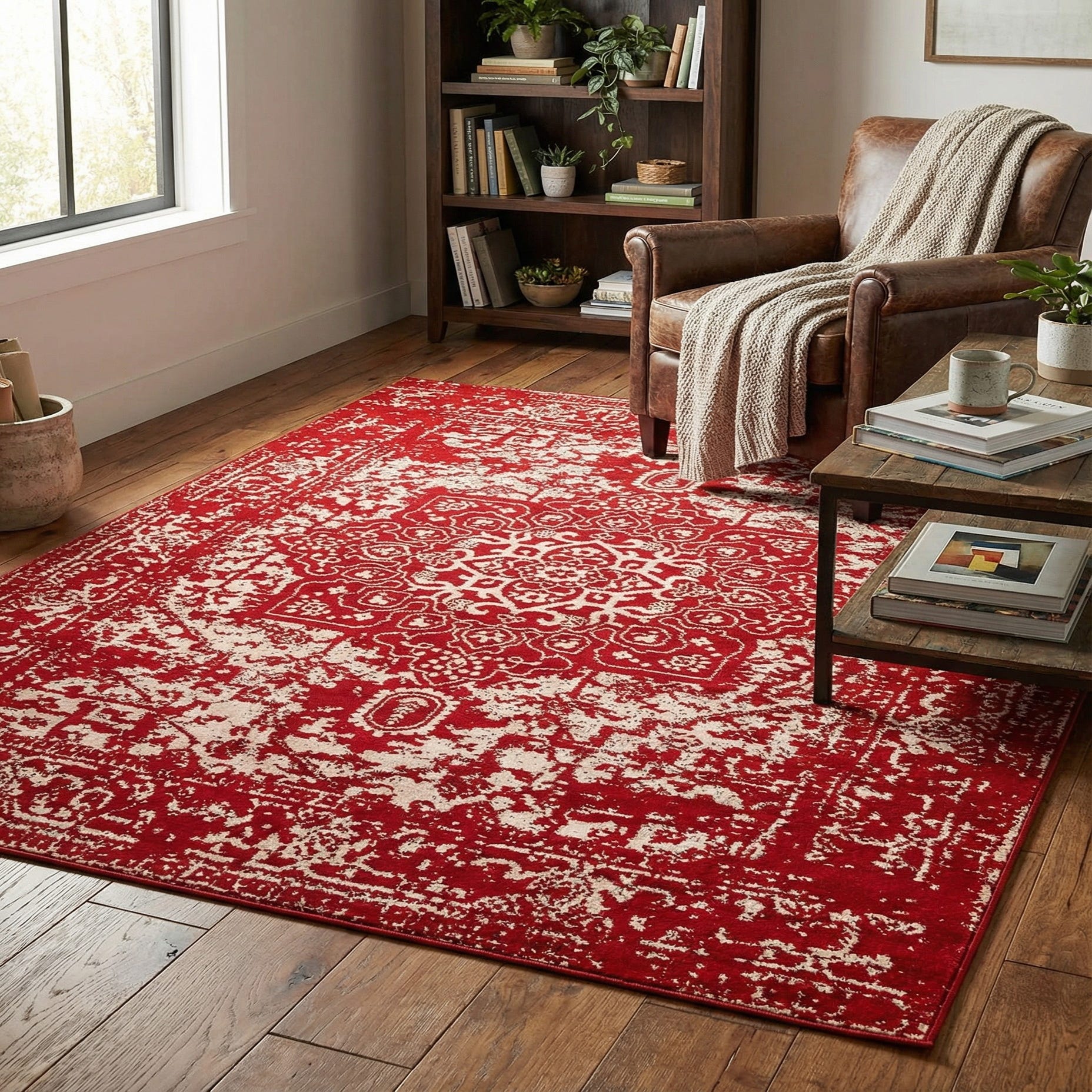 Primary color is Red. Colors in this rug include: Red, Ivory.