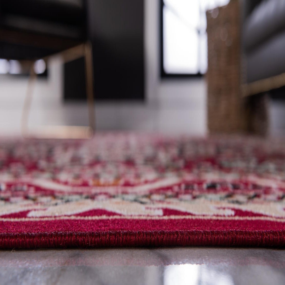 Primary color is Red. Colors in this rug include: Red, Beige, Black, Green, Ivory, Orange.
