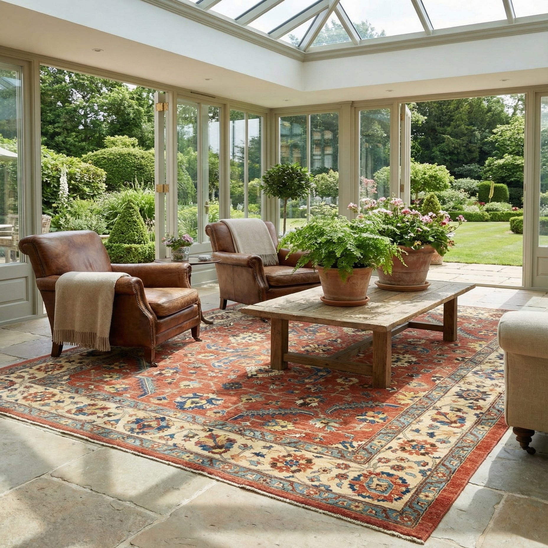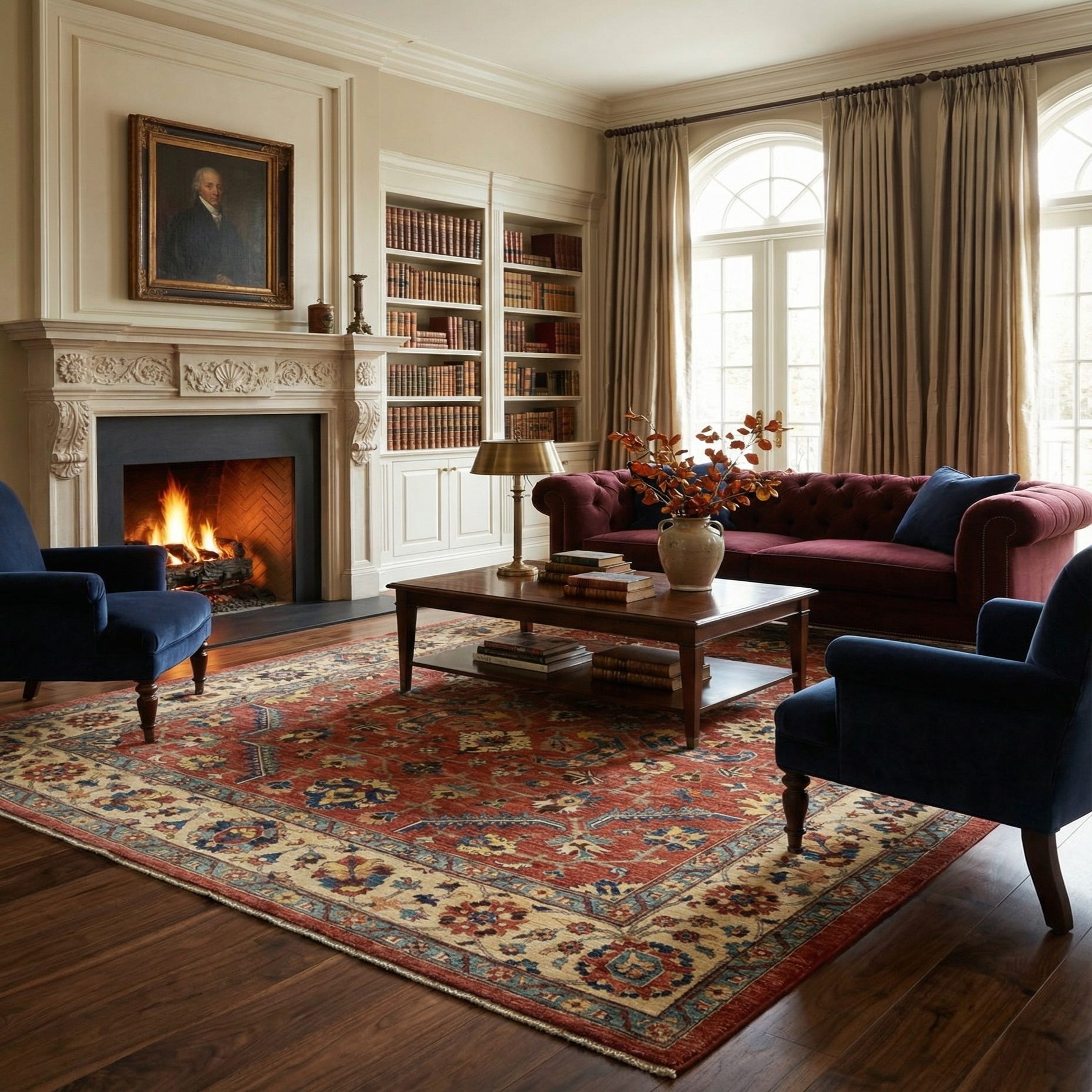 Primary color is Red. Colors in this rug include: Red, Red, Cream, Blue, Brown, Dark Blue, Orange.