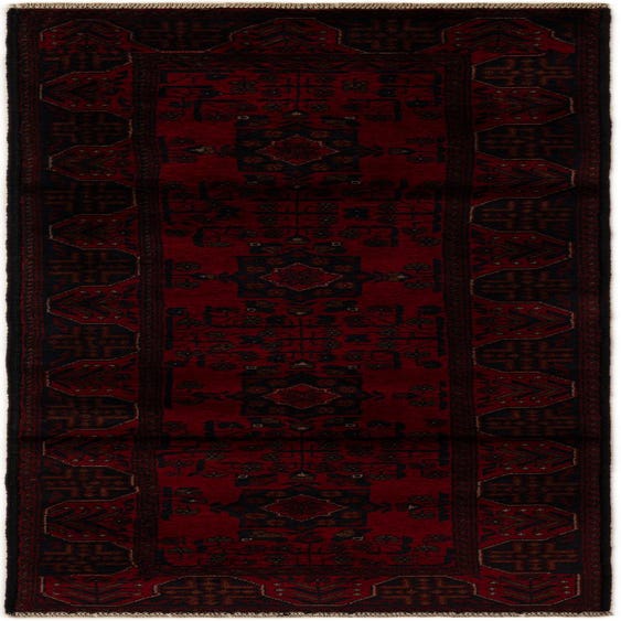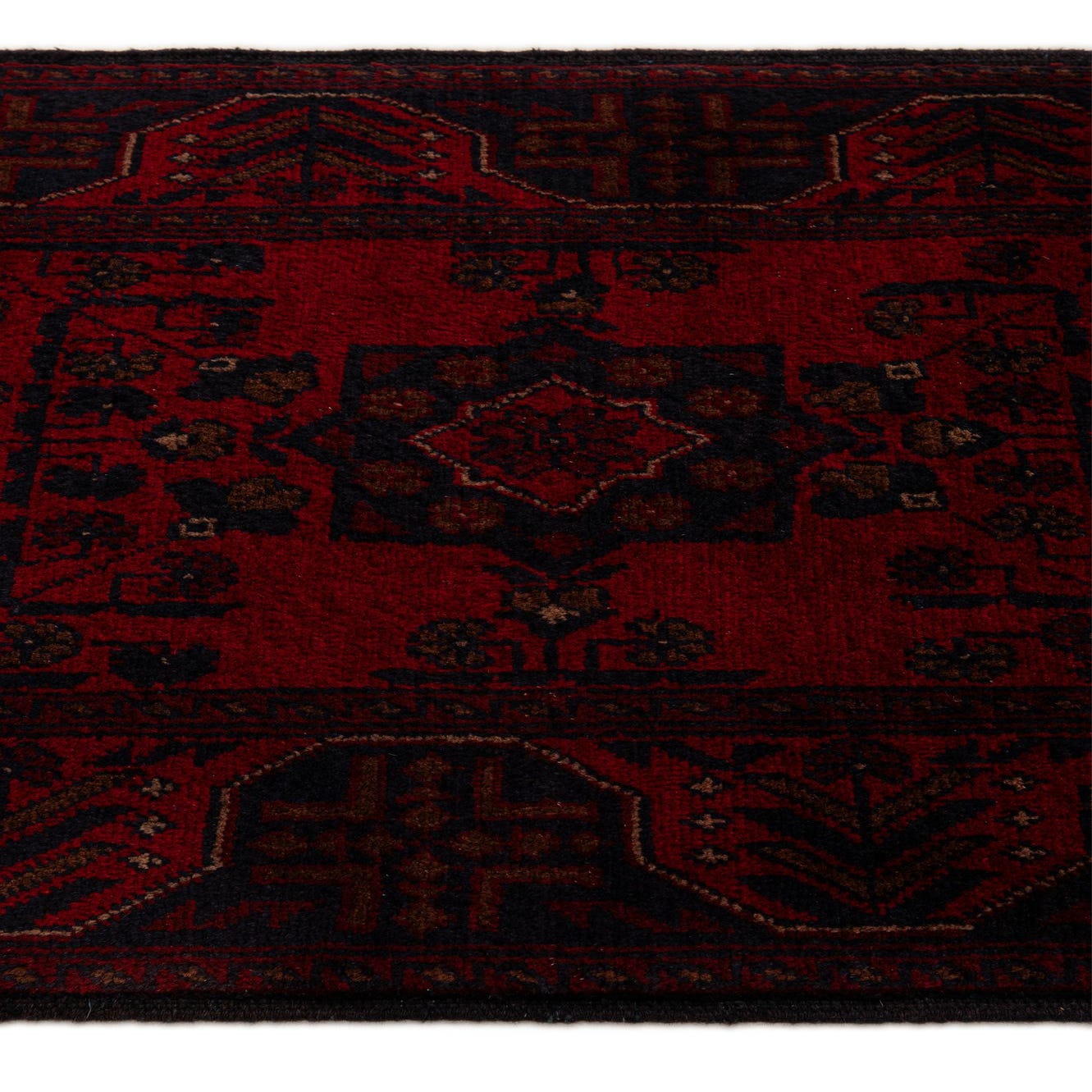 Primary color is Red. Colors in this rug include: Red, Brown, Navy Blue.