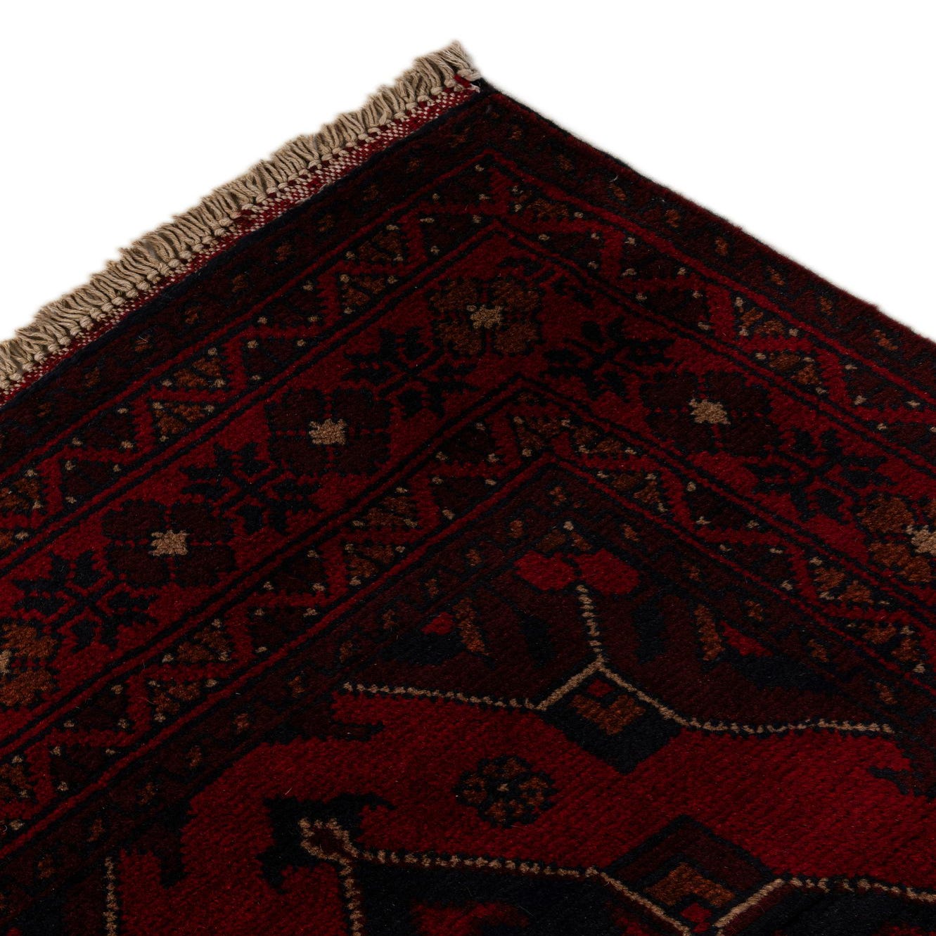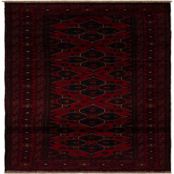 Primary color is Red. Colors in this rug include: Red, Brown, Burgundy, Black.