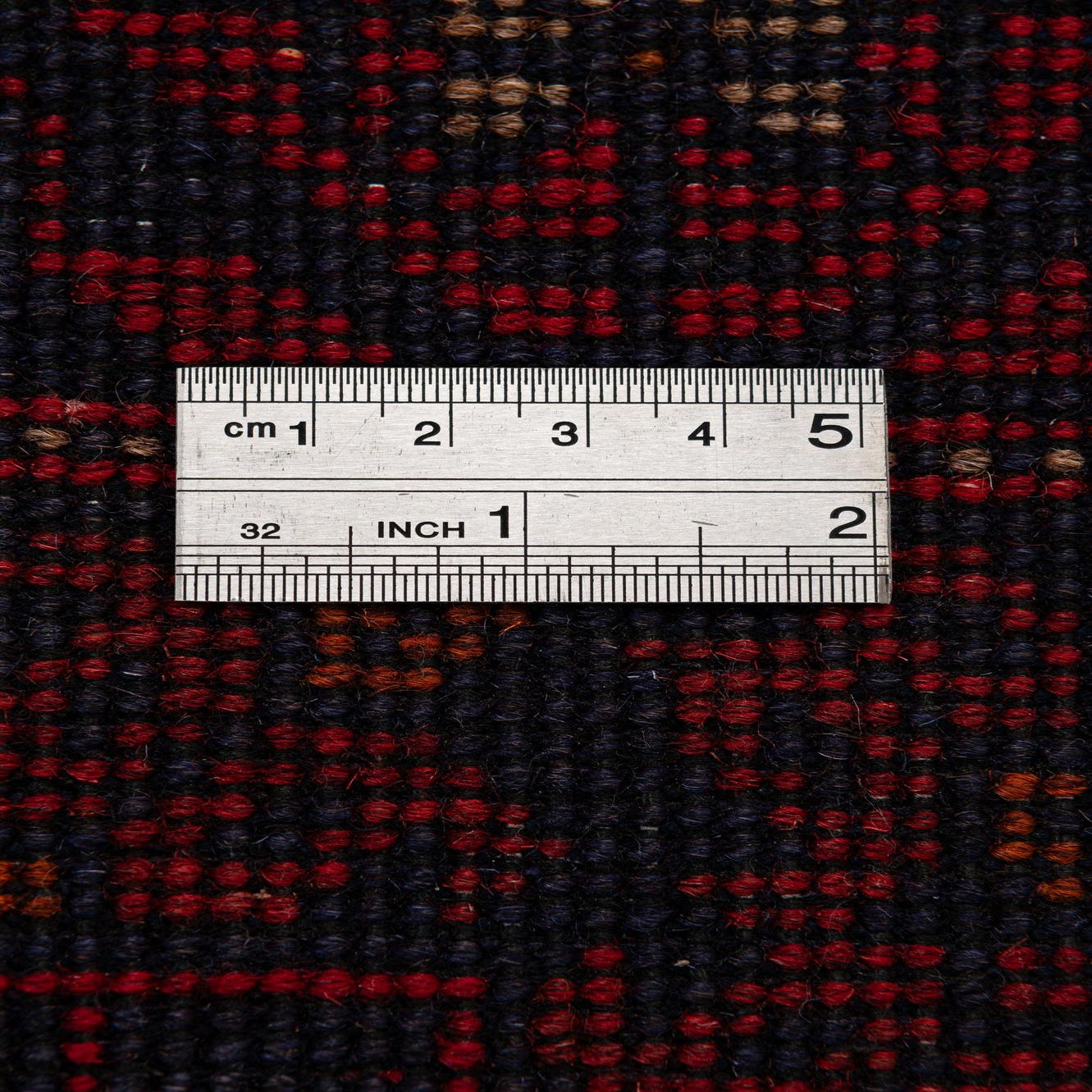 Primary color is Red. Colors in this rug include: Red, Brown, Navy Blue.