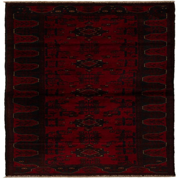 Primary color is Red. Colors in this rug include: Red, Brown, Black.