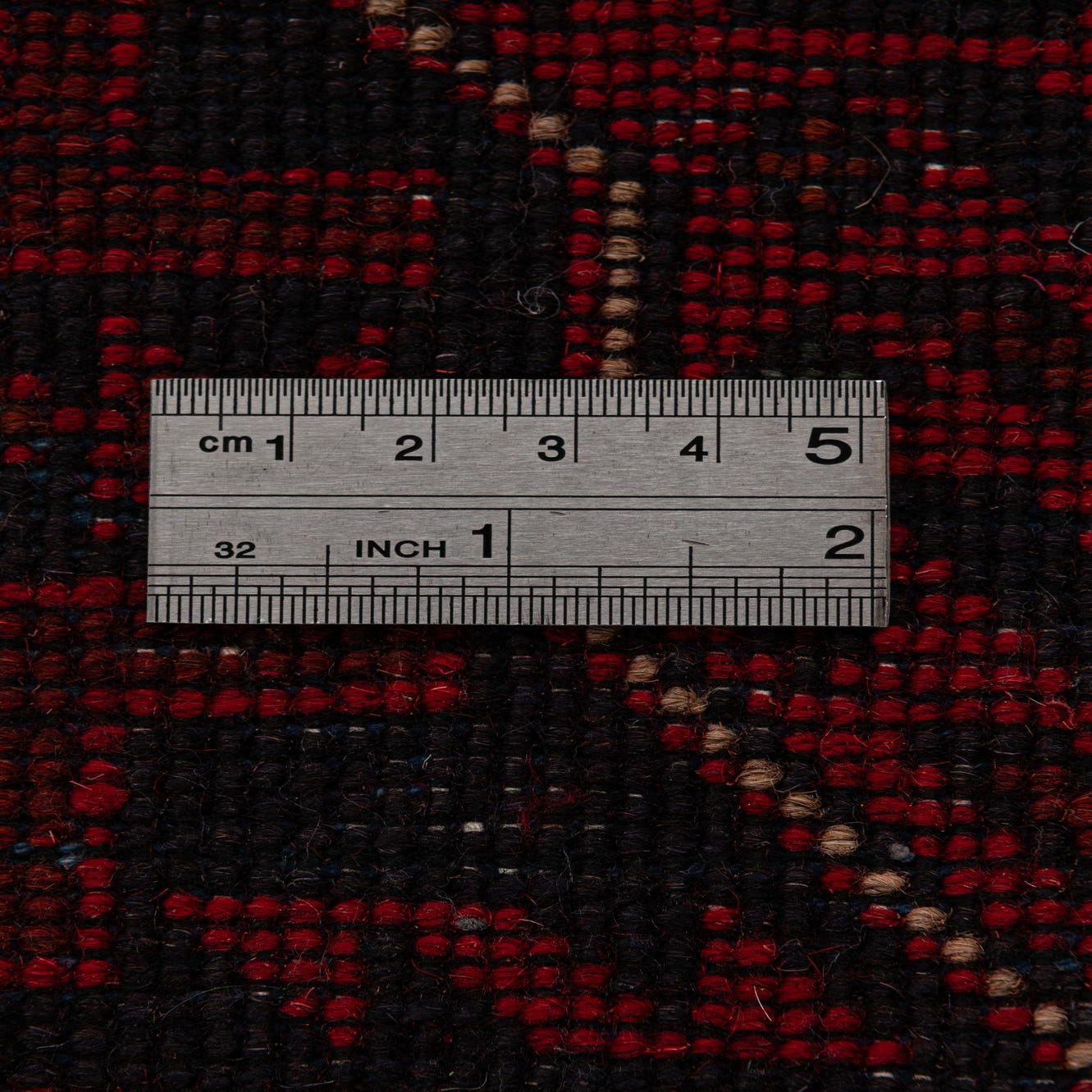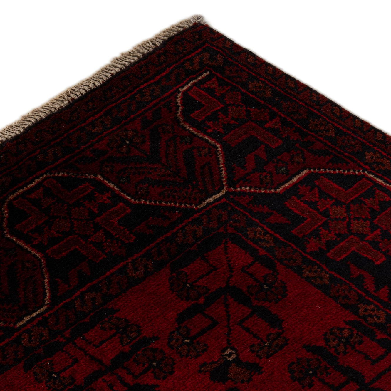 Primary color is Red. Colors in this rug include: Red, Brown, Navy Blue.
