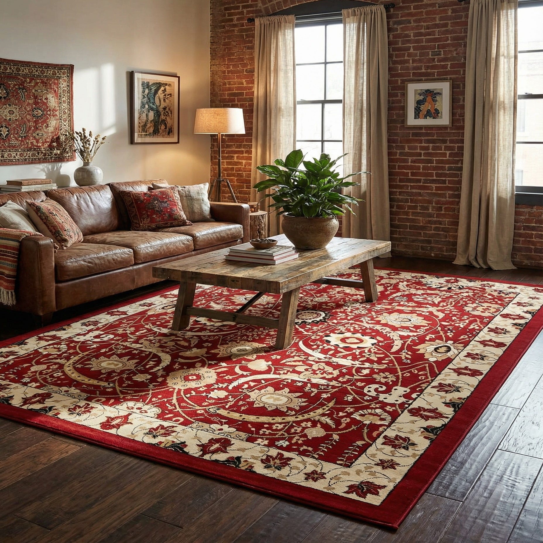 Primary color is Red. Colors in this rug include: Red, Beige, Black, Cream, Tan.