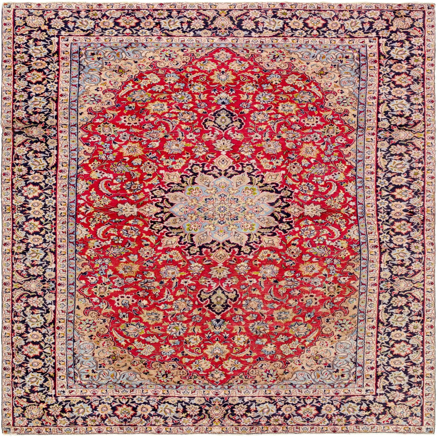 Primary color is Red. Colors in this rug include: Red, Blue, Light Blue, Ivory, Navy Blue, Peach, Olive.