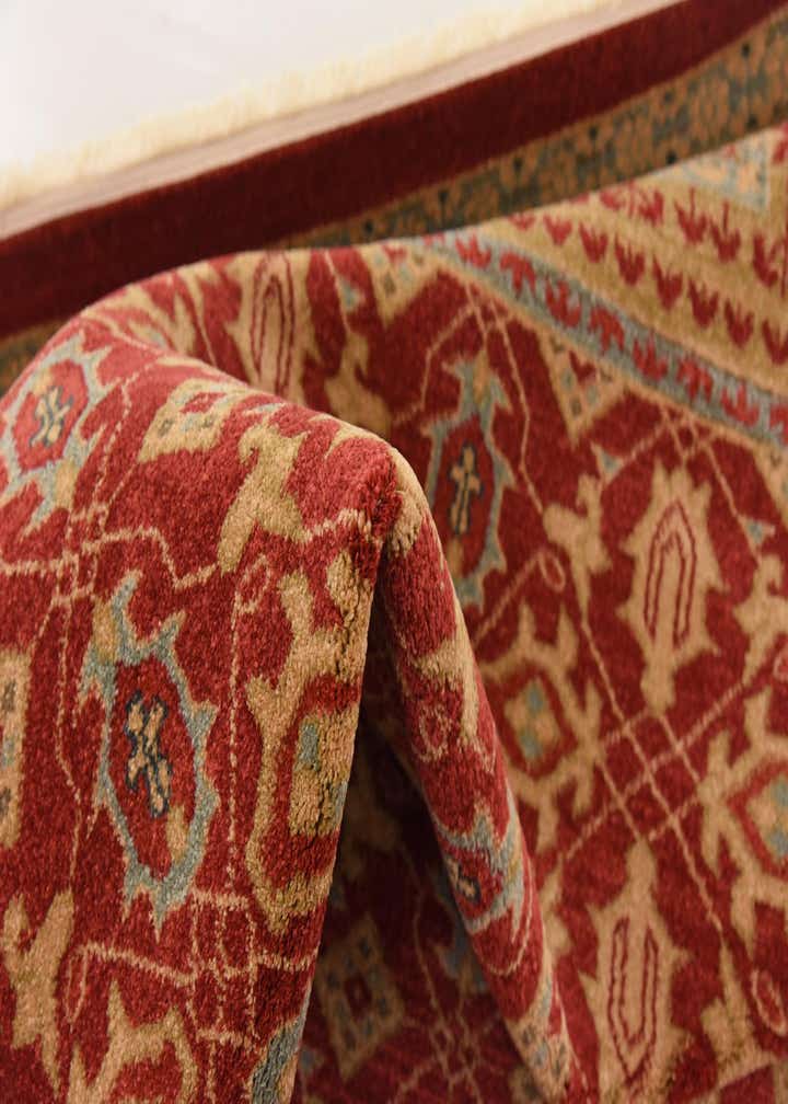 Primary color is Red. Colors in this rug include: Red, Light Blue, Light Brown, Light Green, Navy Blue.