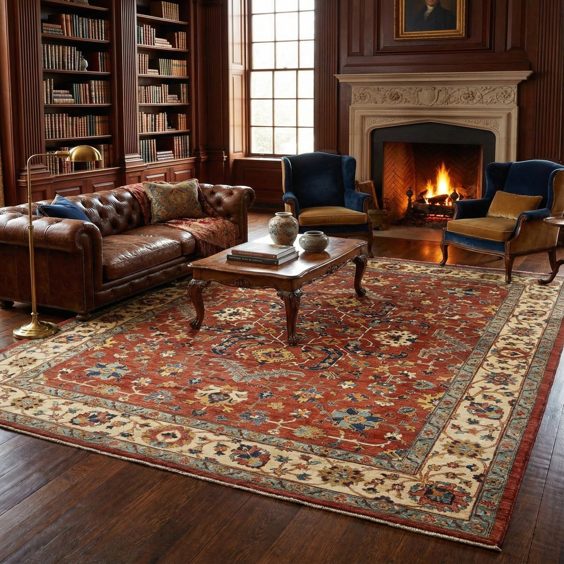 Primary color is Red. Colors in this rug include: Red, Red, Cream, Blue, Brown, Orange, Dark Blue.