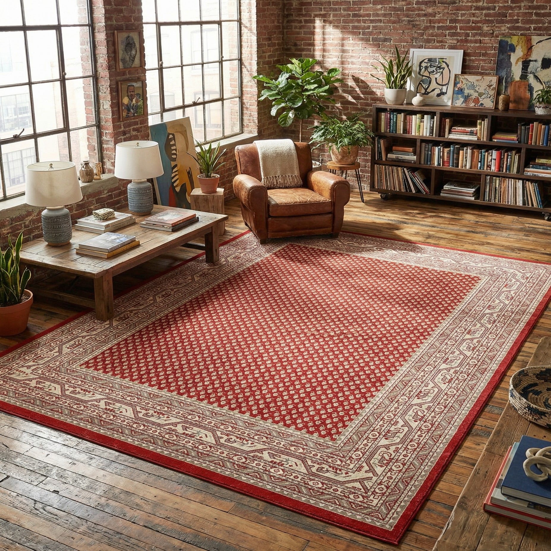 Primary color is Red. Colors in this rug include: Red, Gray, Ivory.