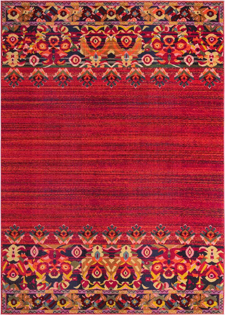 Primary color is Red. Colors in this rug include: Red, Puce, Purple, Pink, Plum Red, Blue, Navy Blue, Ivory, Yellow, Gold, Green, Burgundy, Peach.