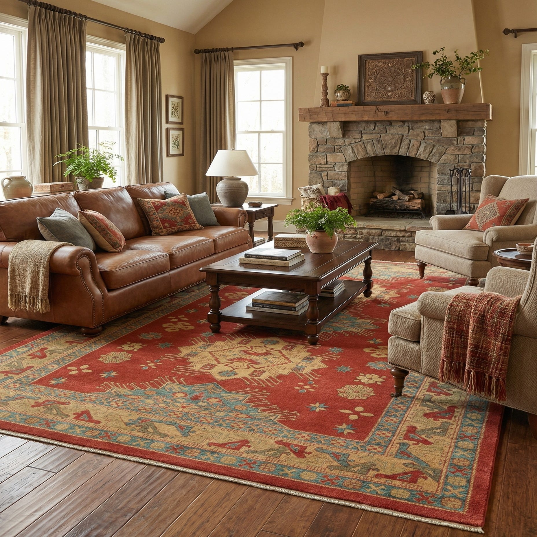 Primary color is Red. Colors in this rug include: Red, Cream, Light Blue.