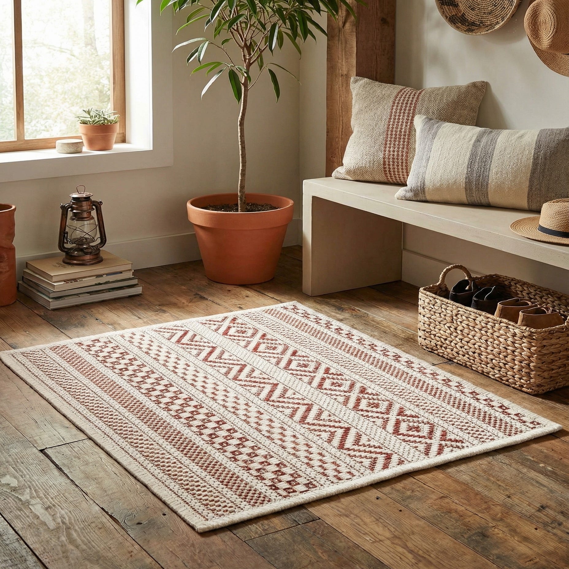 Primary color is Red. Colors in this rug include: Red, Ivory.