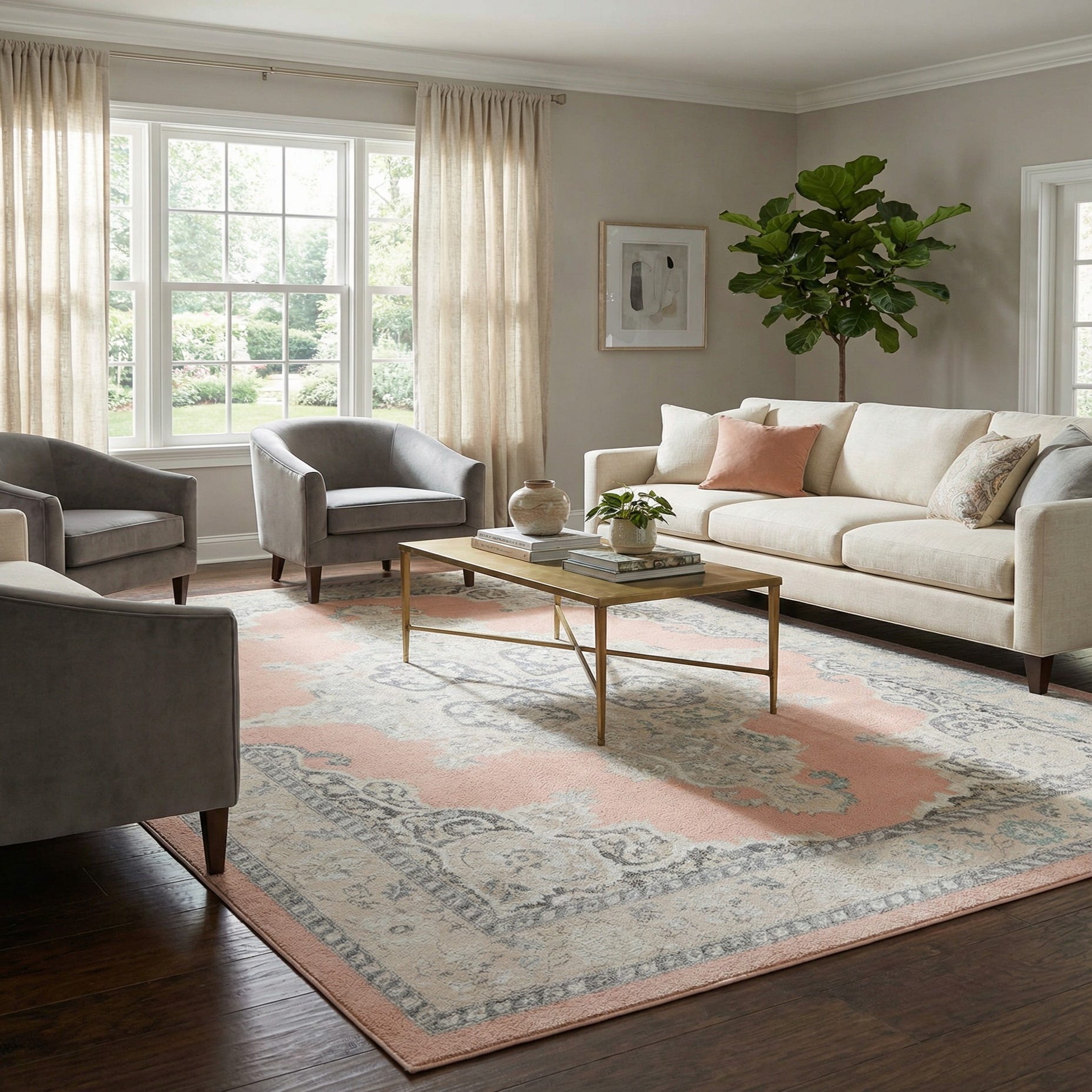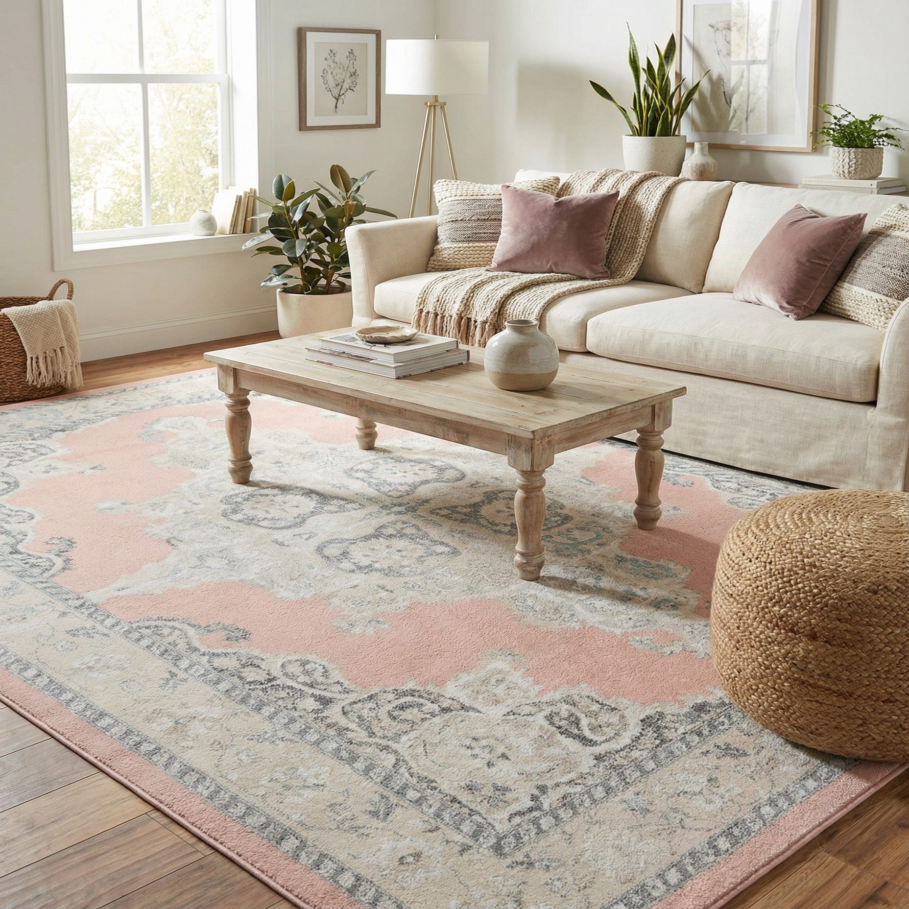 Primary color is Rose. Colors in this rug include: Rose, Beige, Gray, Ivory, Light Green.