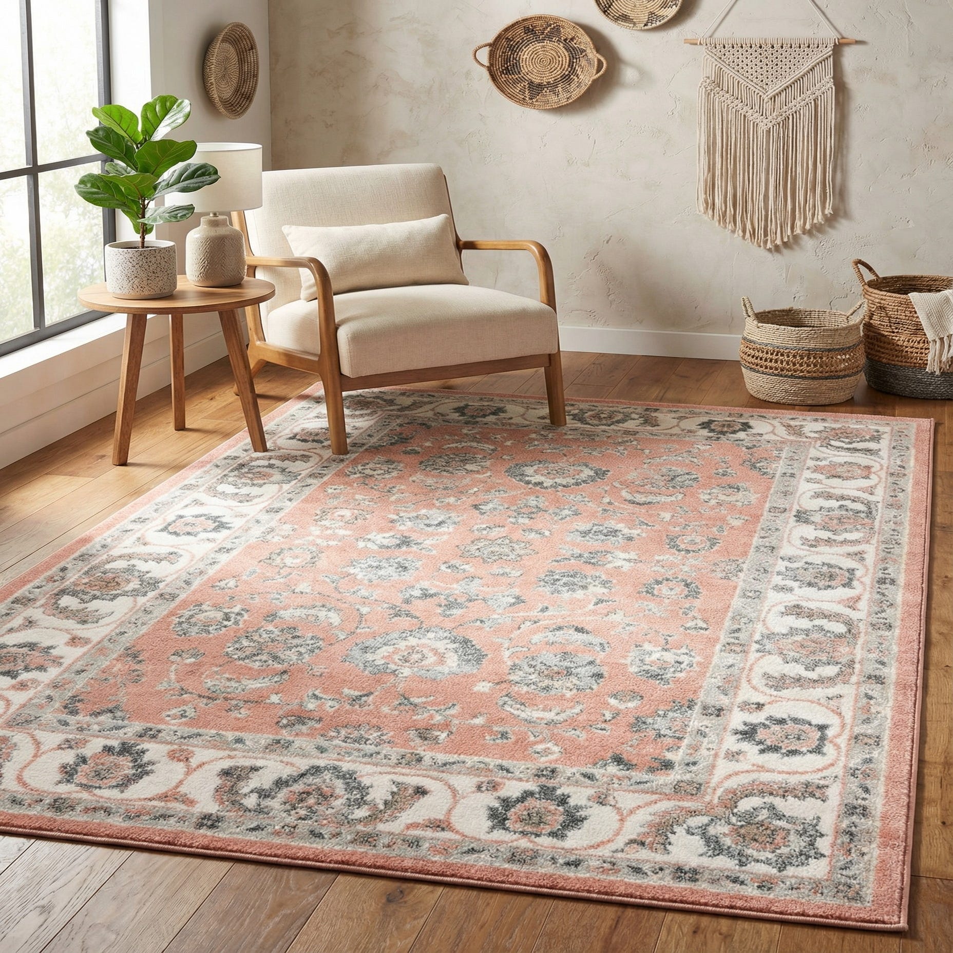 Primary color is Rose. Colors in this rug include: Rose, Gray, Ivory.