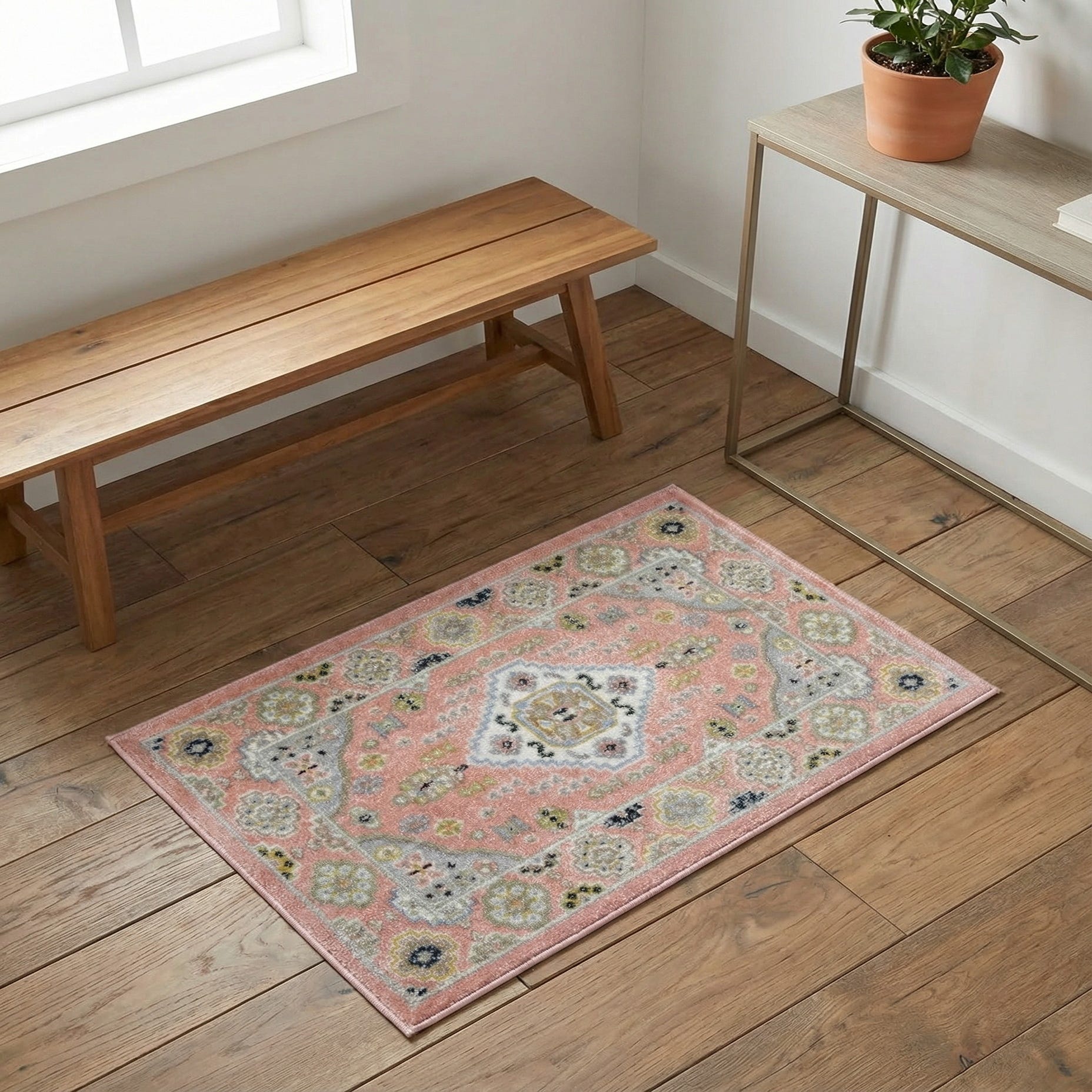 Primary color is Rose Pink. Colors in this rug include: Rose Pink, Black, Gray, Ivory, Green, Light Blue.