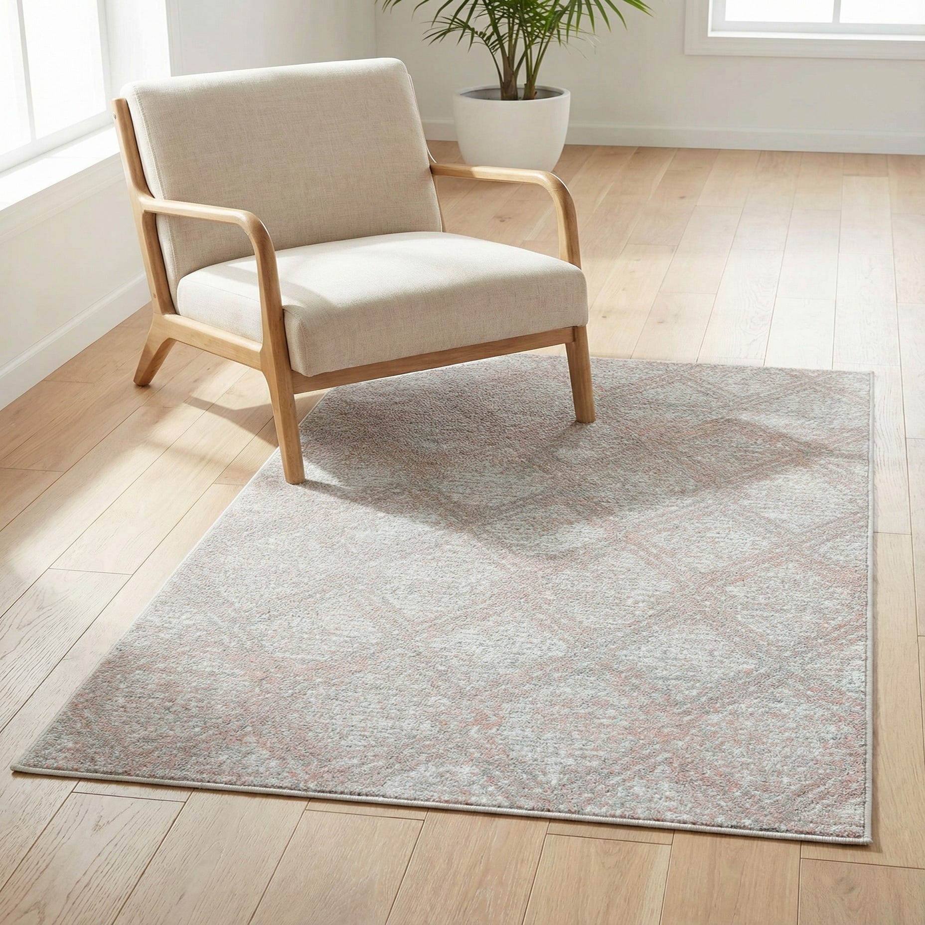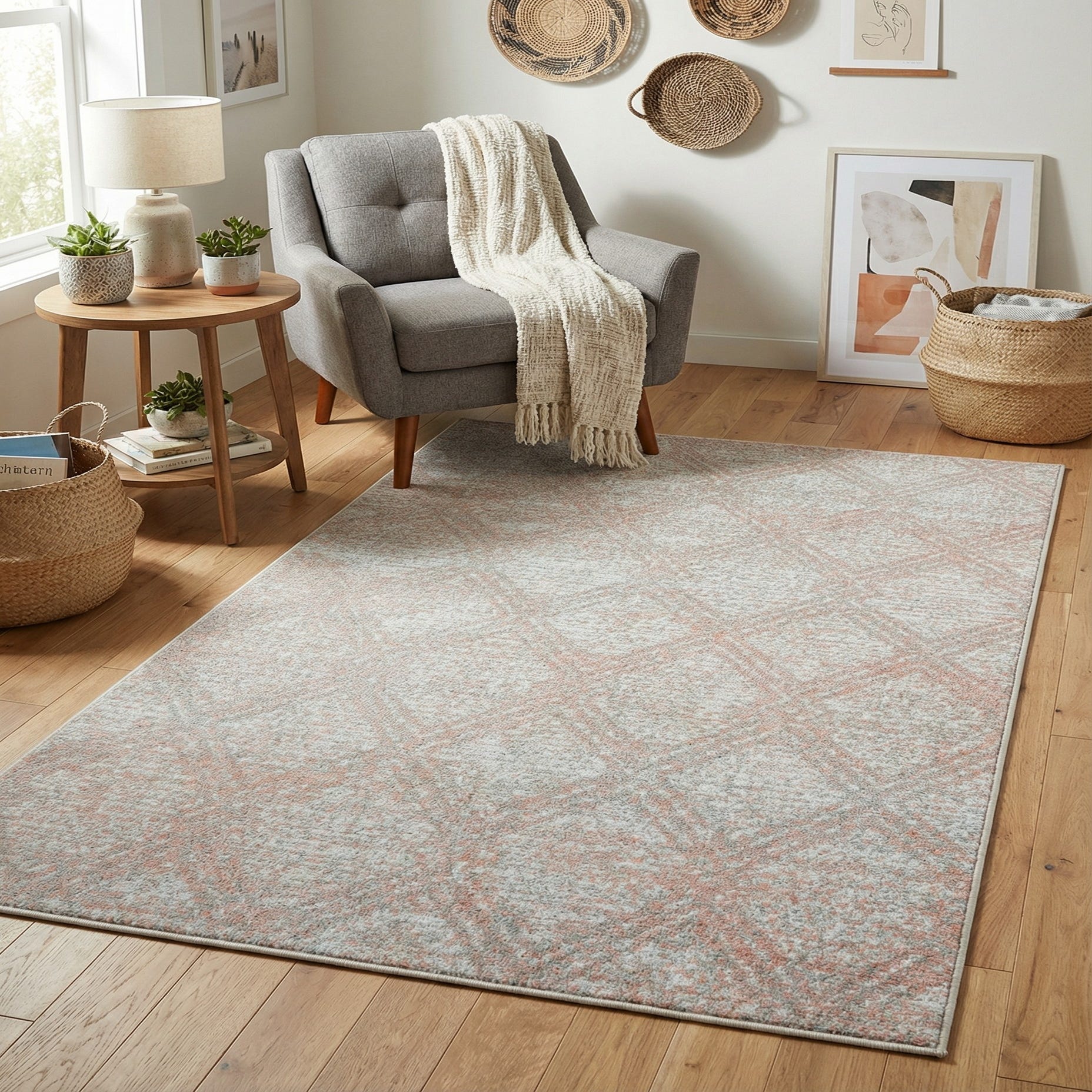 Primary color is Rose Pink. Colors in this rug include: Rose Pink, Gray, Ivory.