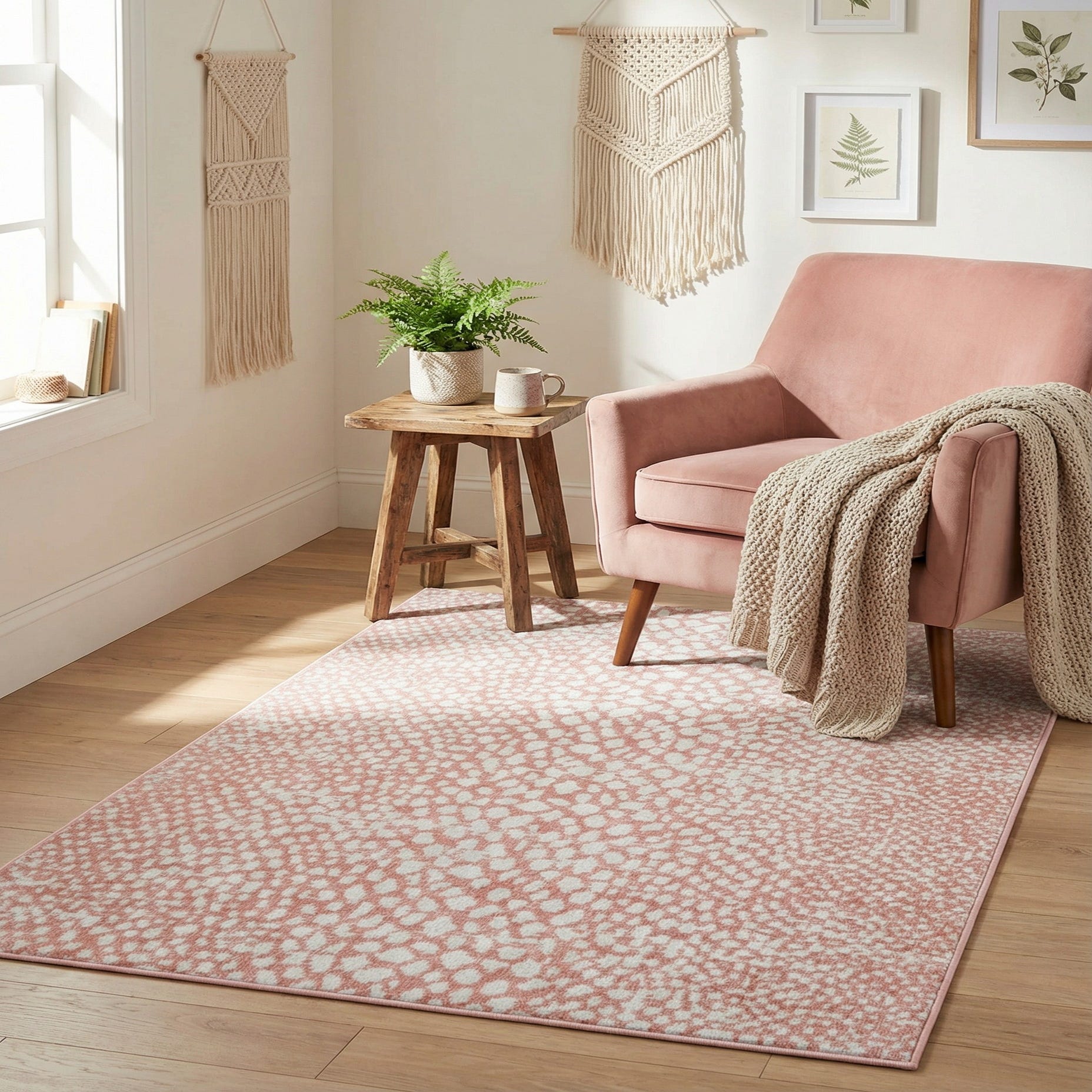 Primary color is Rose Pink. Colors in this rug include: Rose Pink, Ivory.
