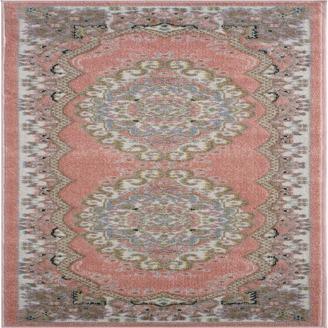 Primary color is Rose Pink. Colors in this rug include: Rose Pink, Beige, Ivory, Light Blue.
