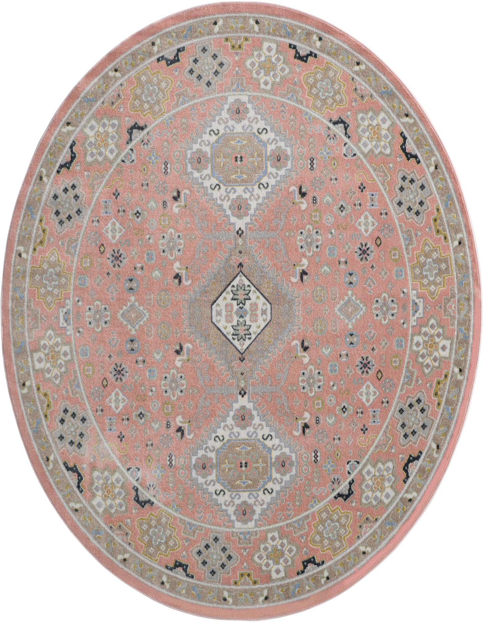 Primary color is Rose Pink. Colors in this rug include: Rose Pink, Black, Ivory, Gray, Green, Light Blue.