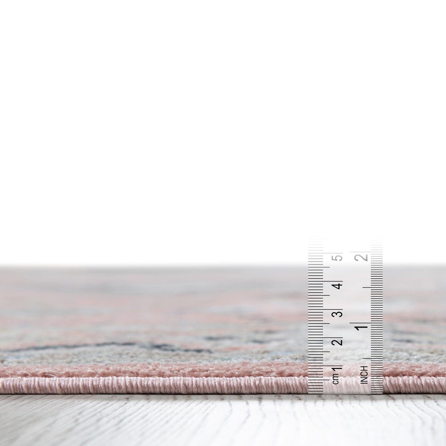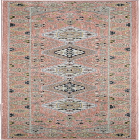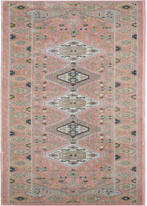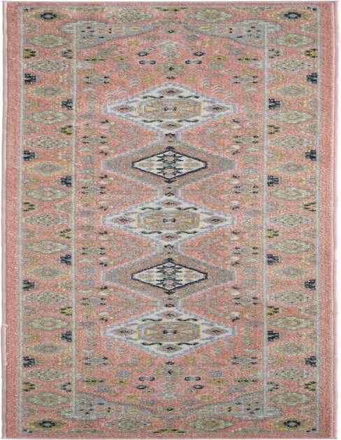 Primary color is Rose Pink. Colors in this rug include: Rose Pink, Black, Gray, Green, Ivory, Light Blue.