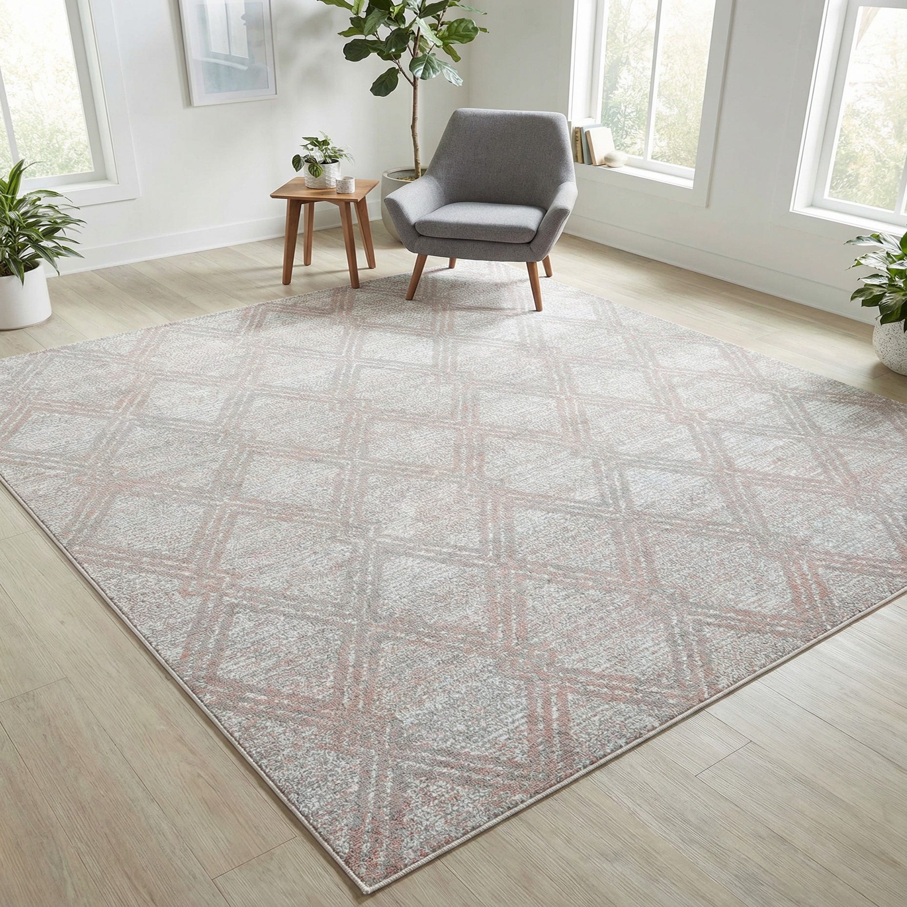 Primary color is Rose Pink. Colors in this rug include: Rose Pink, Gray, Ivory.