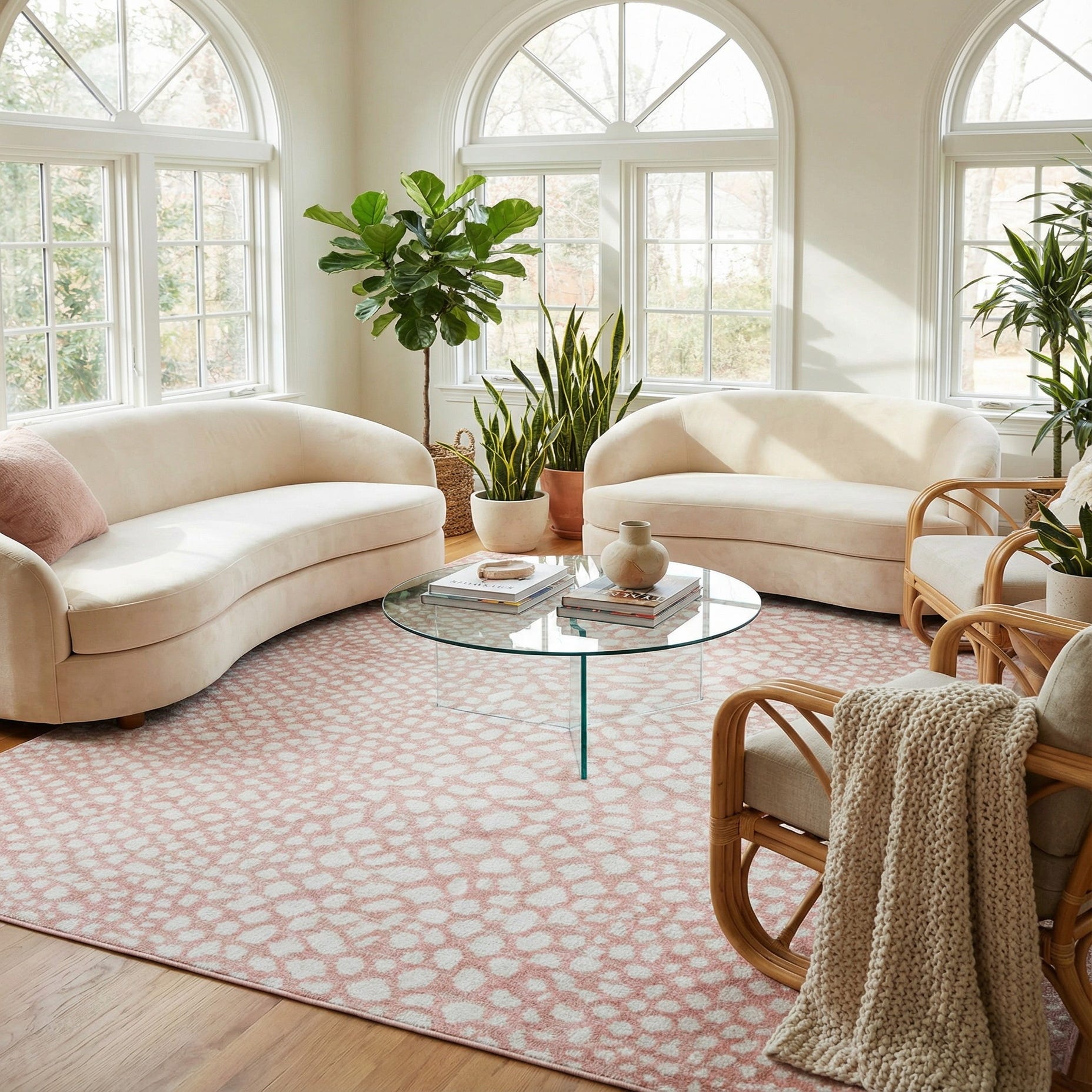 Primary color is Rose Pink. Colors in this rug include: Rose Pink, Ivory.