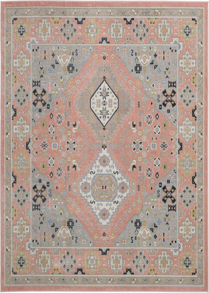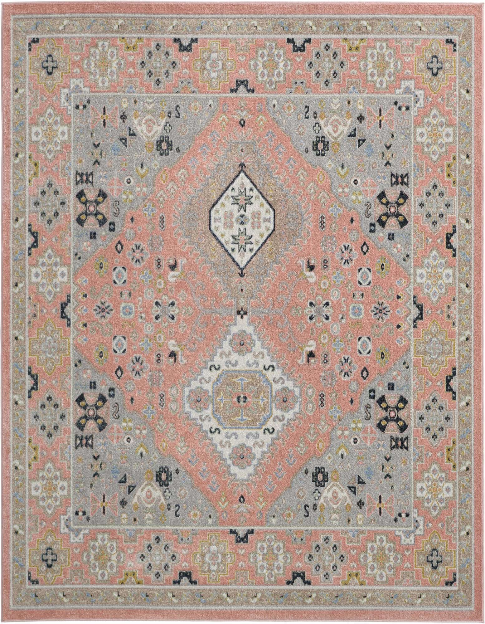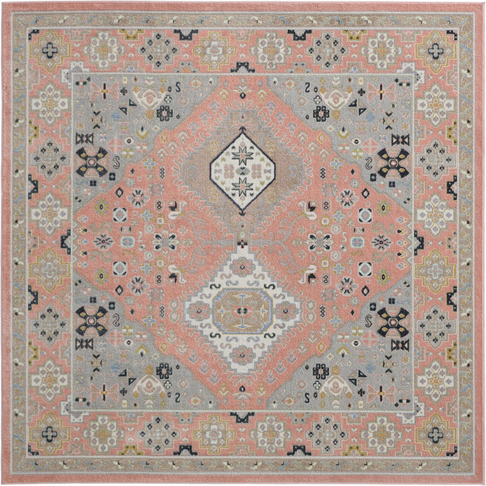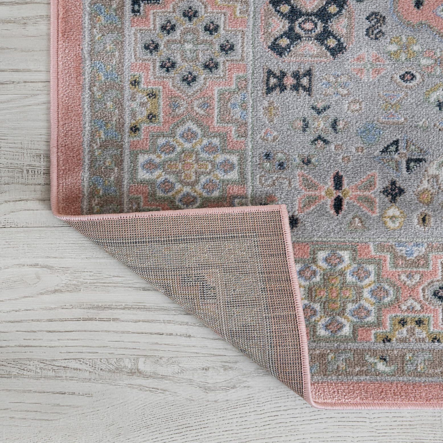 Primary color is Rose Pink. Colors in this rug include: Rose Pink, Black, Gray, Green, Light Blue.