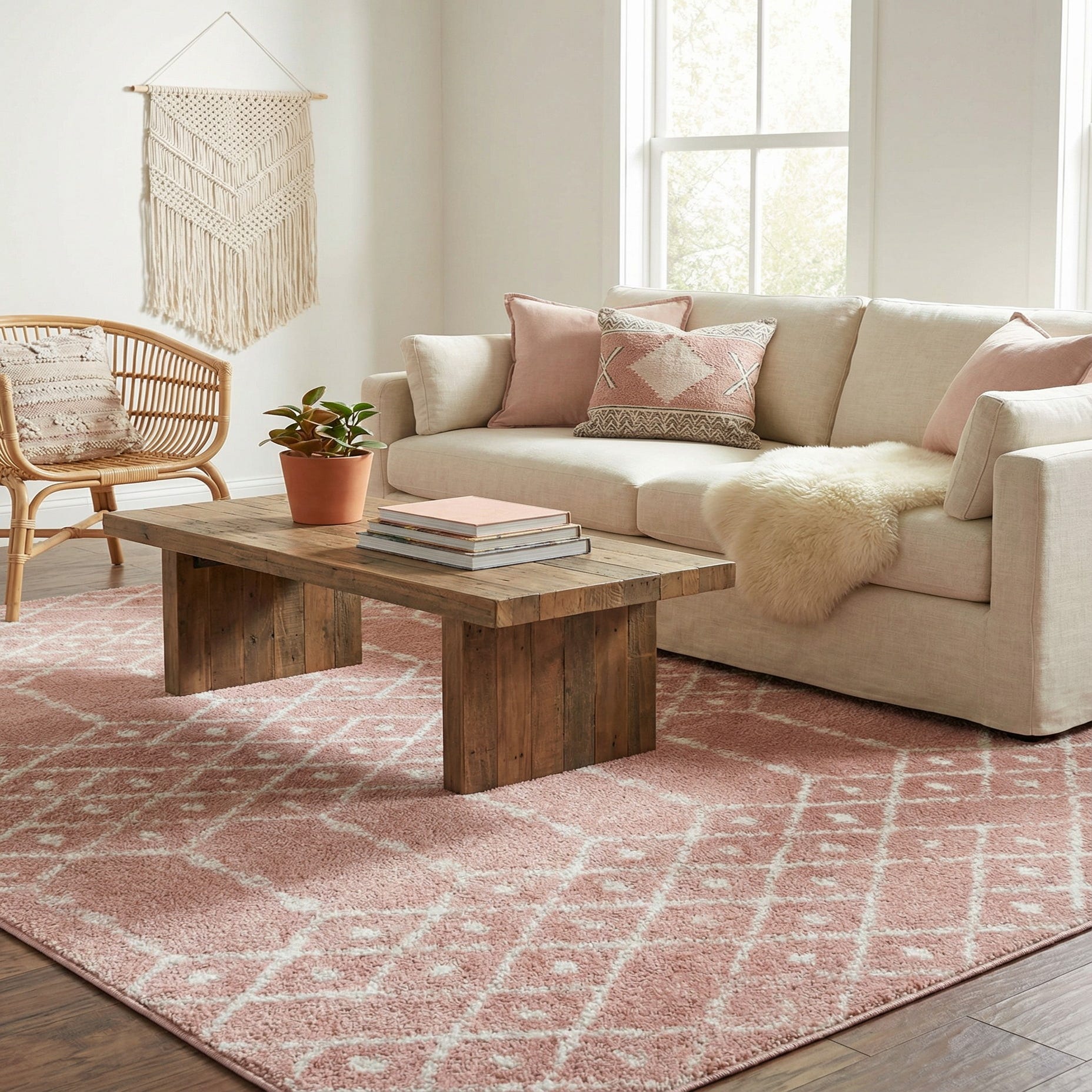 Primary color is Rose Pink. Colors in this rug include: Rose Pink, Ivory.