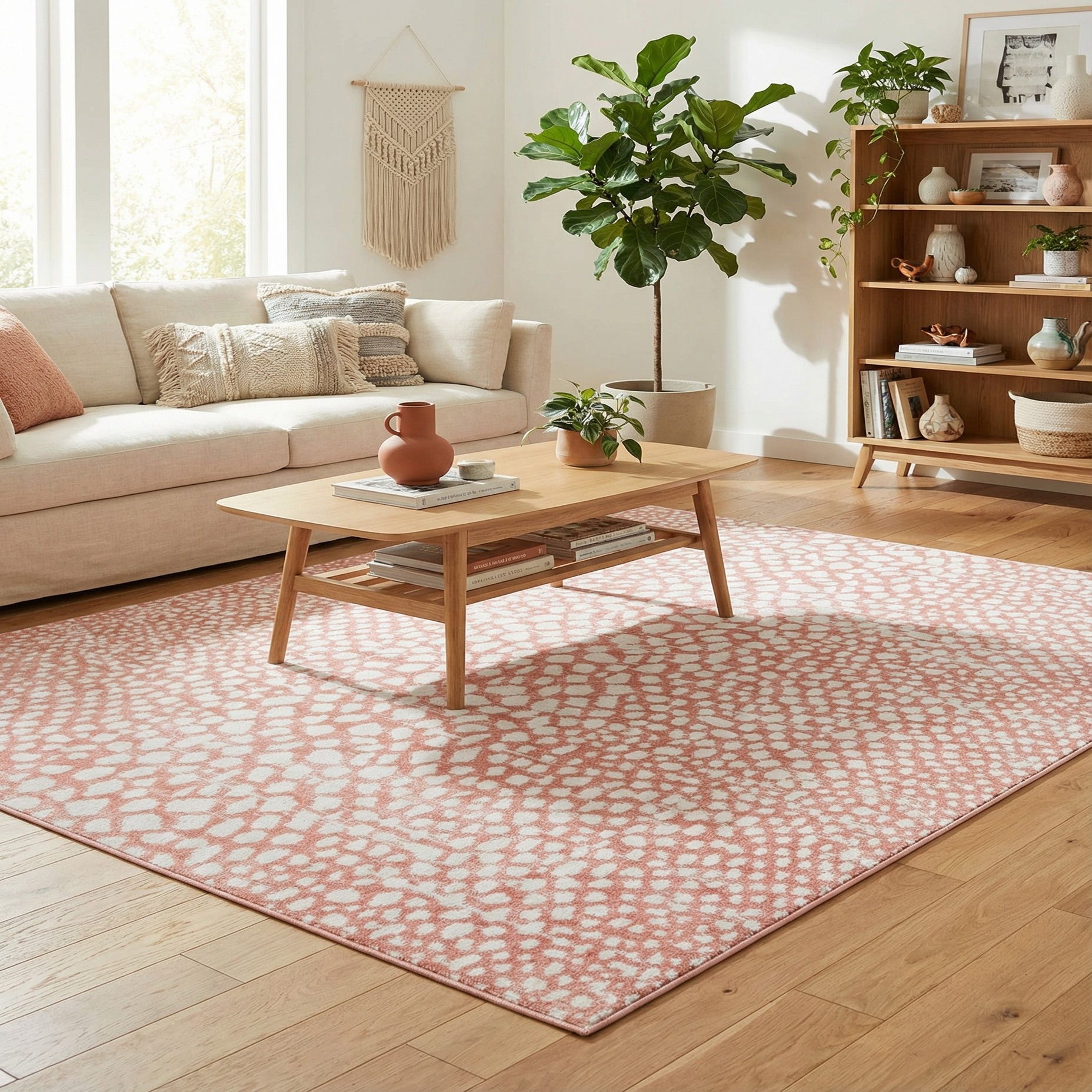 Primary color is Rose Pink. Colors in this rug include: Rose Pink, Ivory.