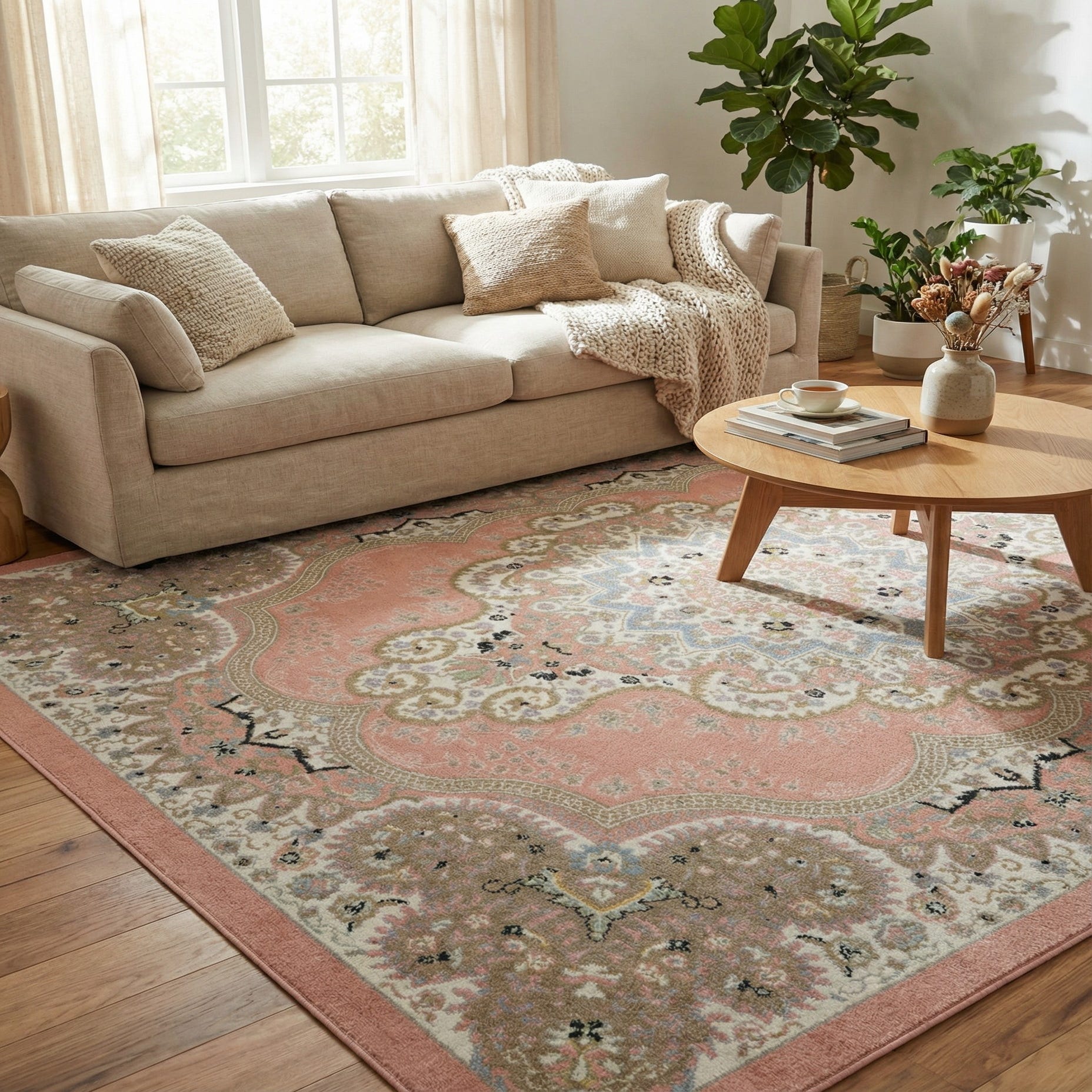 Primary color is Rose Pink. Colors in this rug include: Rose Pink, Beige, Ivory, Light Blue.