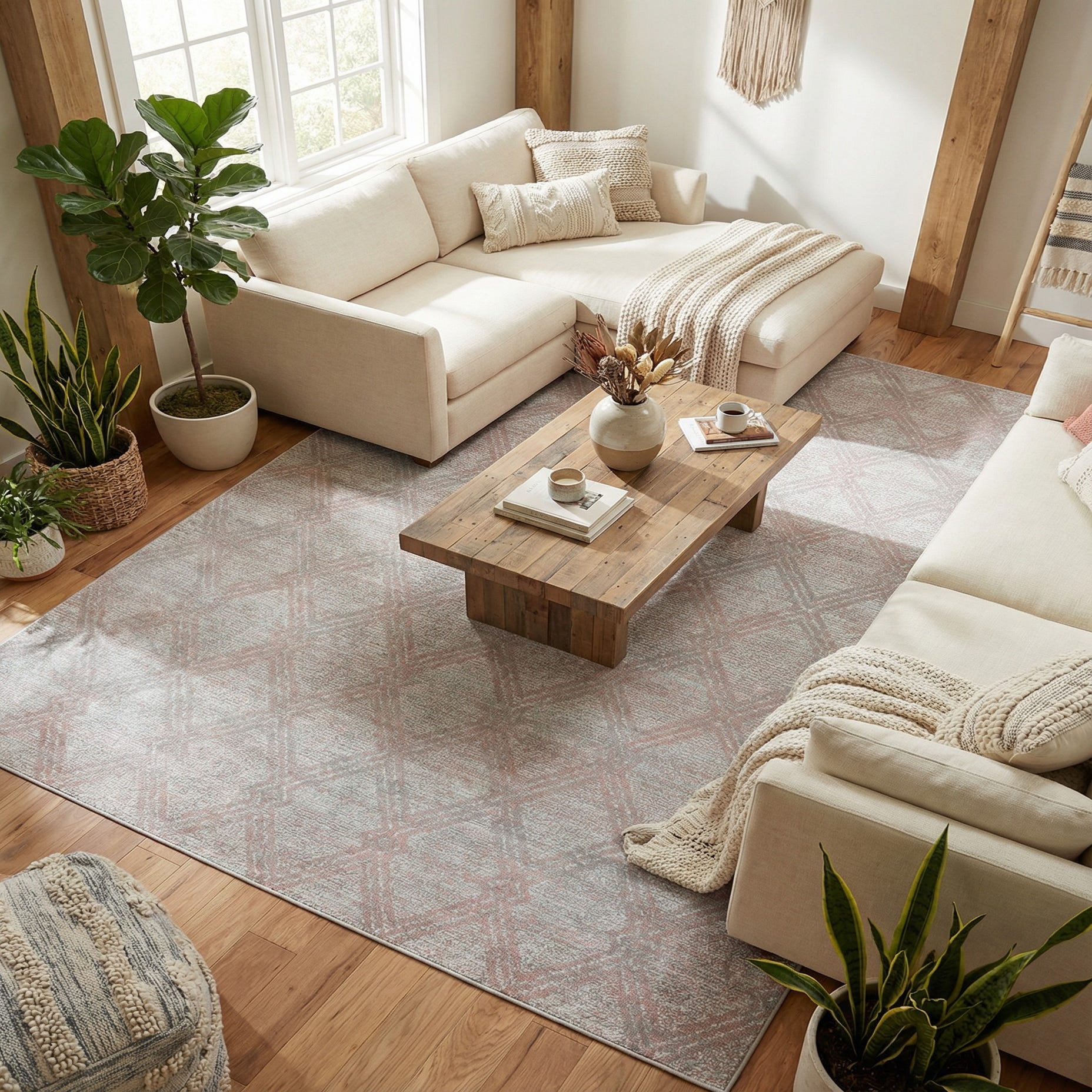 Primary color is Rose Pink. Colors in this rug include: Rose Pink, Gray, Ivory.