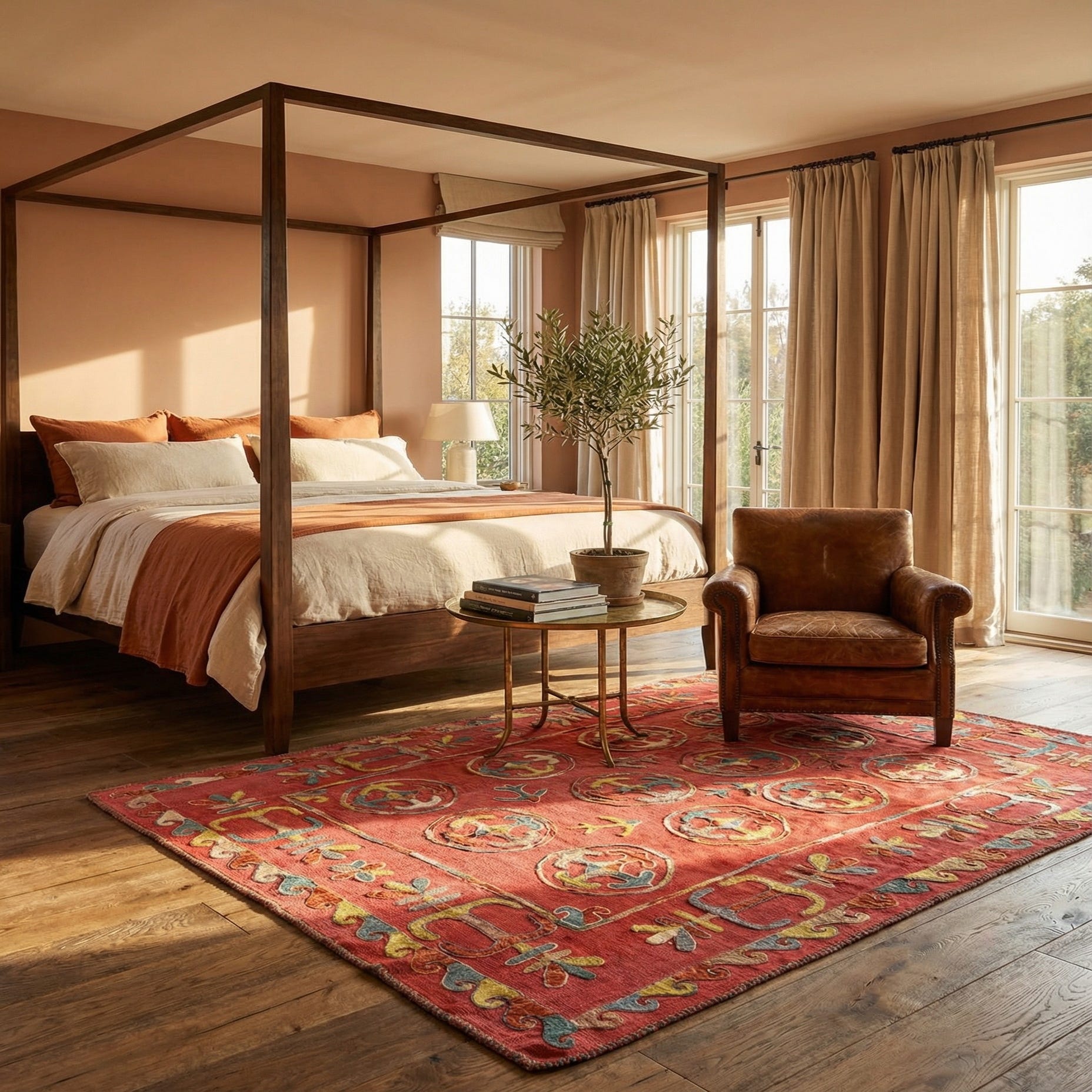 Primary color is Rose Red. Colors in this rug include: Rose Red, Blue, Orange, Yellow, Ivory, Light Blue, Light Brown, Light Green, Light Salmon.