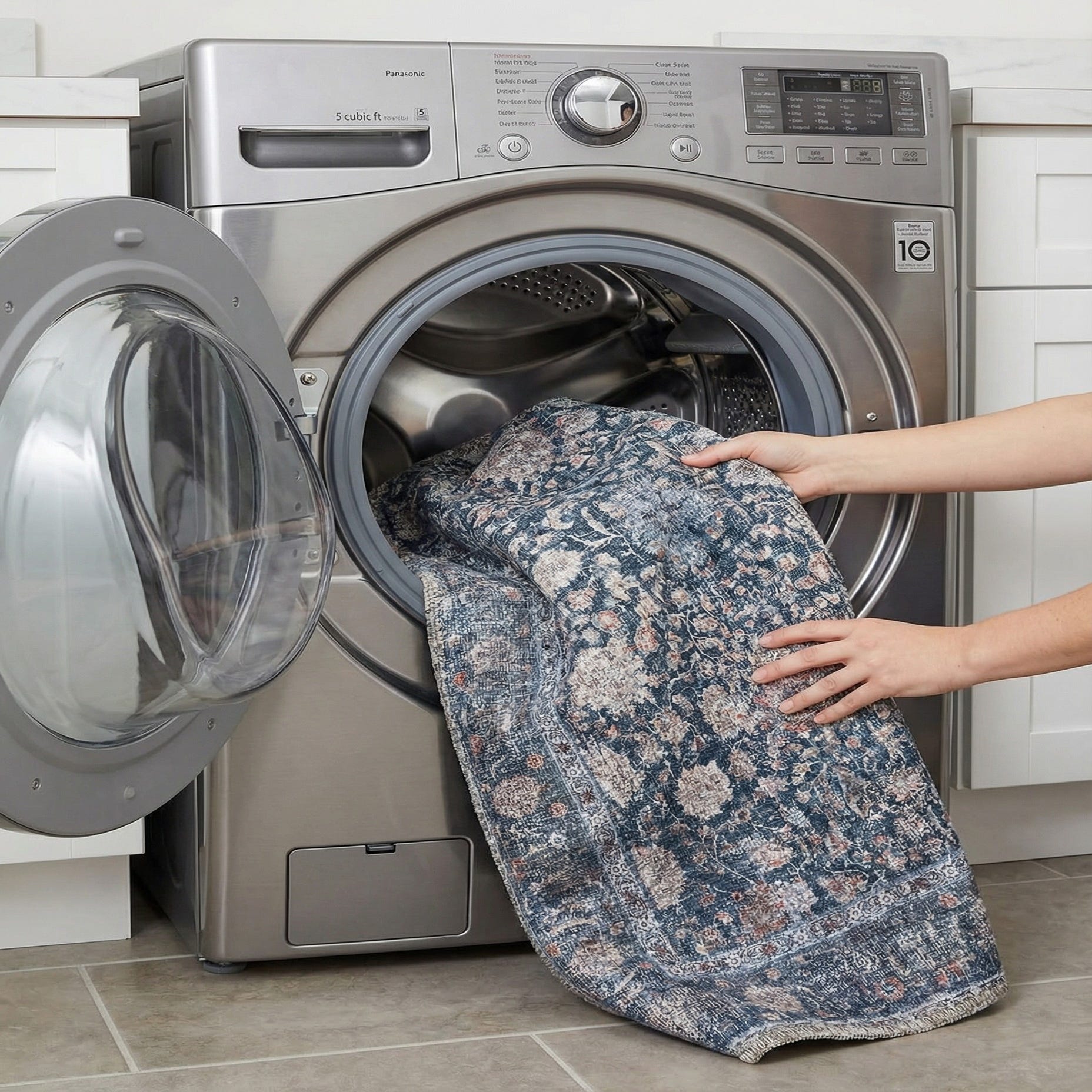 Primary color is Royal Navy Blue. Colors in this rug include: Royal Navy Blue, Gray, Ivory, Light Blue, Rust Red.