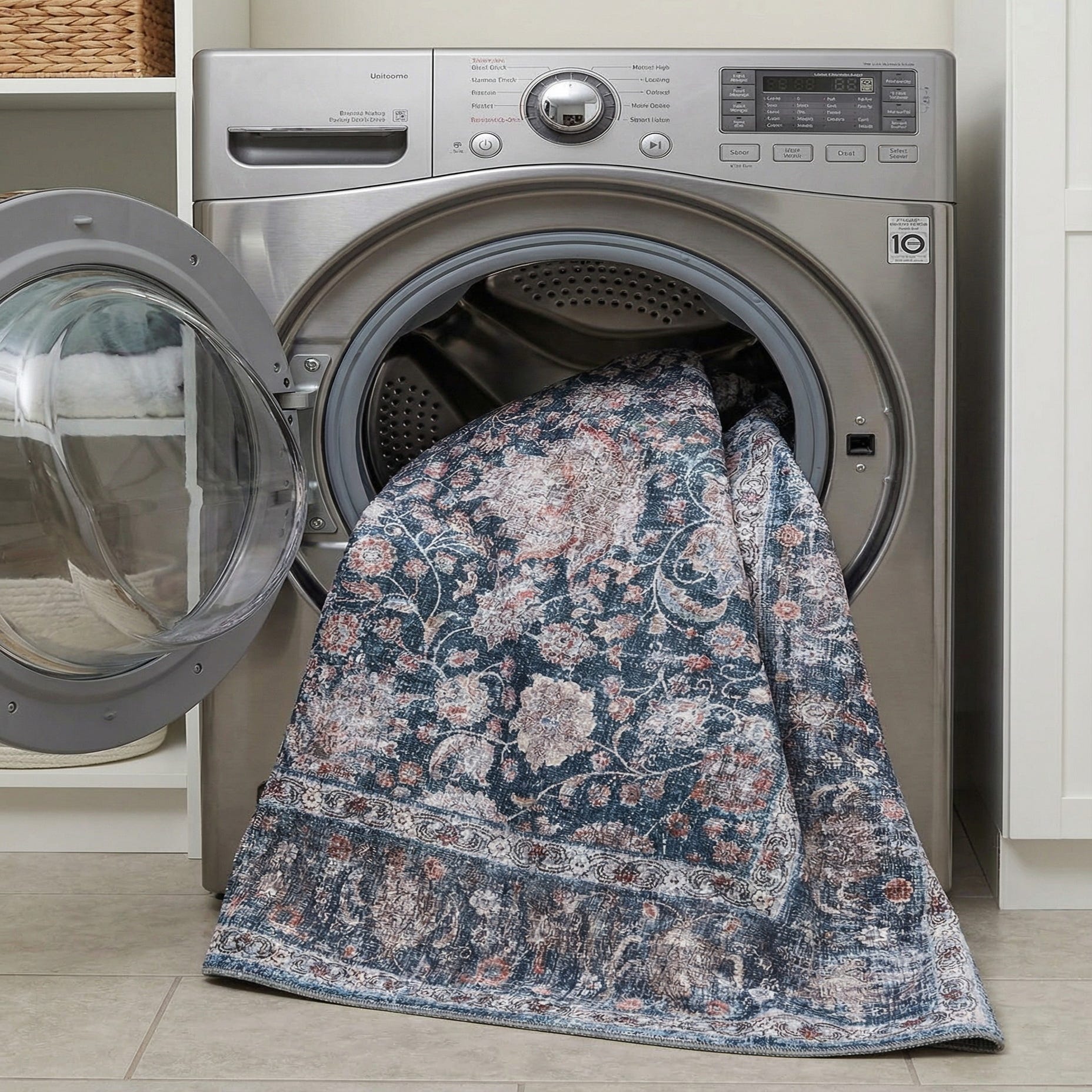 Primary color is Royal Navy Blue. Colors in this rug include: Royal Navy Blue, Gray, Ivory, Light Blue, Rust Red.