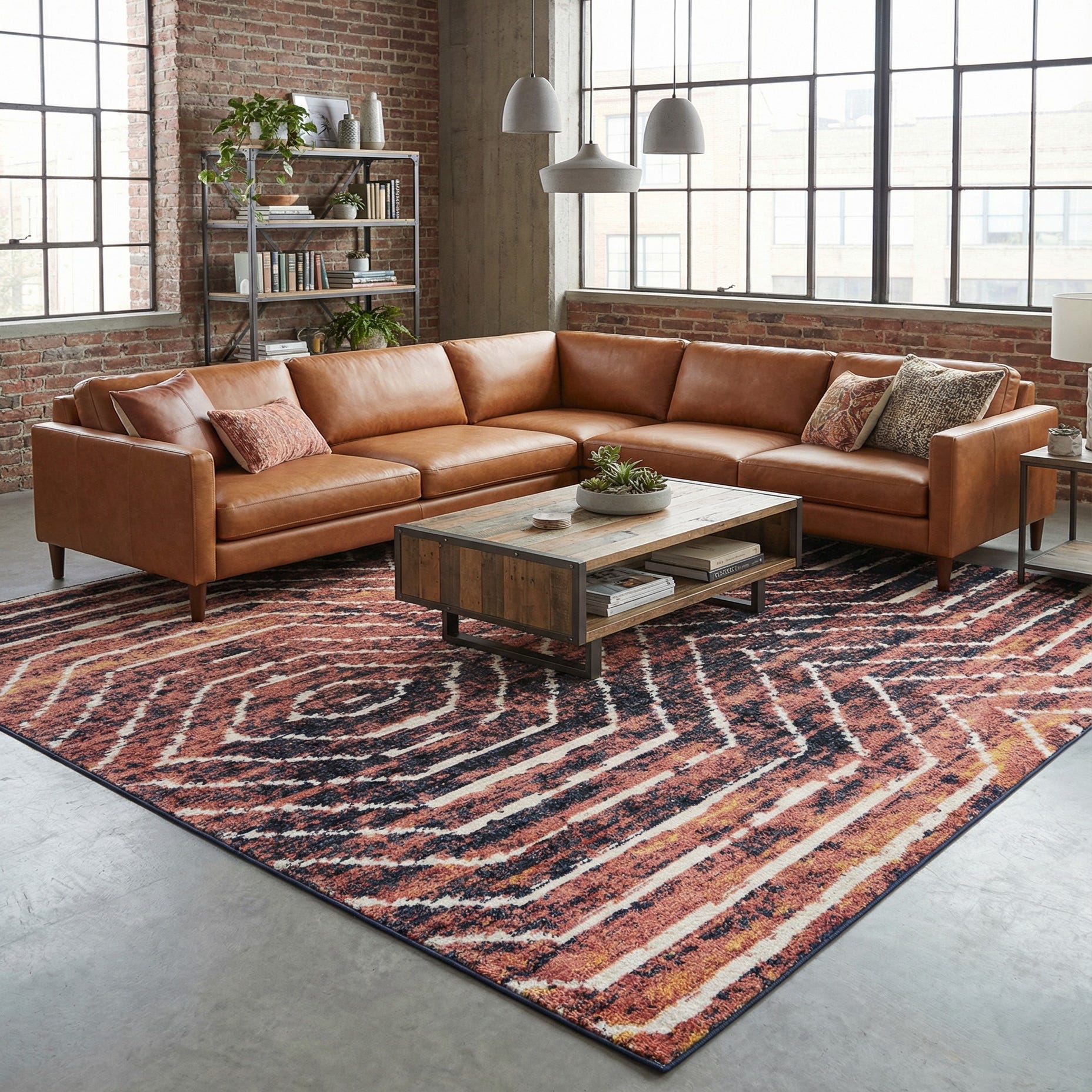 Primary color is Rust Orange. Colors in this rug include: Rust Orange, Black, Ivory, Navy Blue.