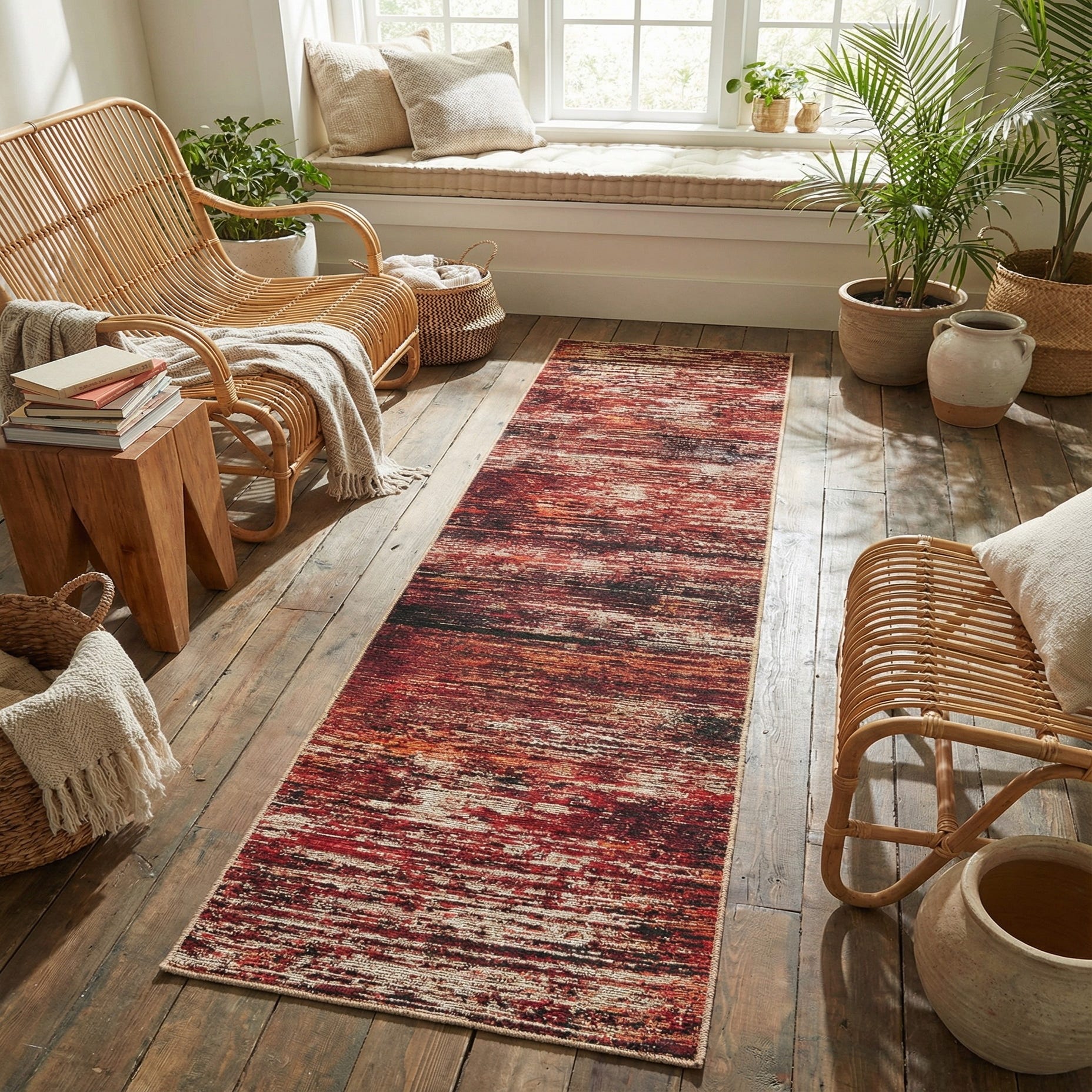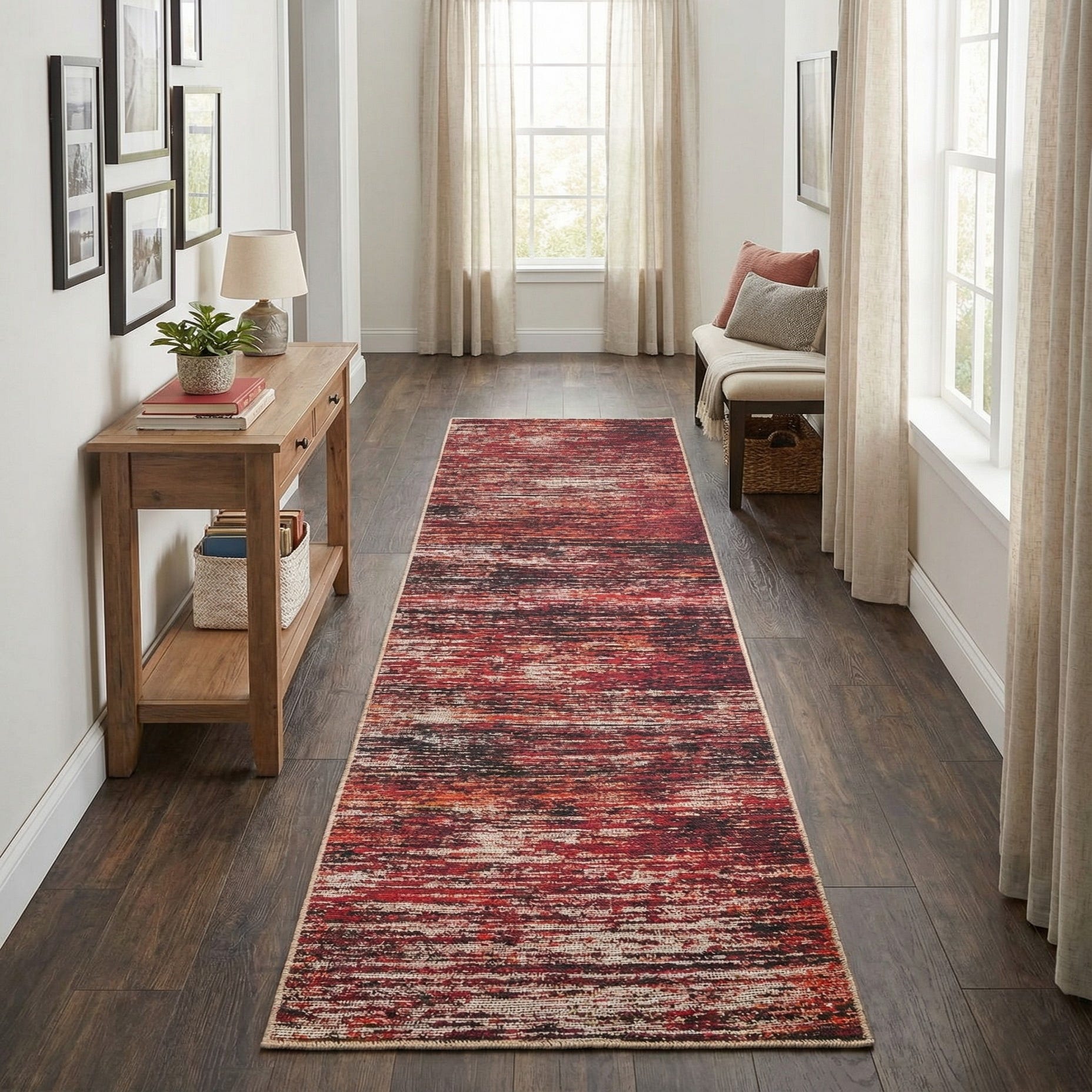 Primary color is Rust Red. Colors in this rug include: Rust Red, Black, Brown, Beige, Burgundy.
