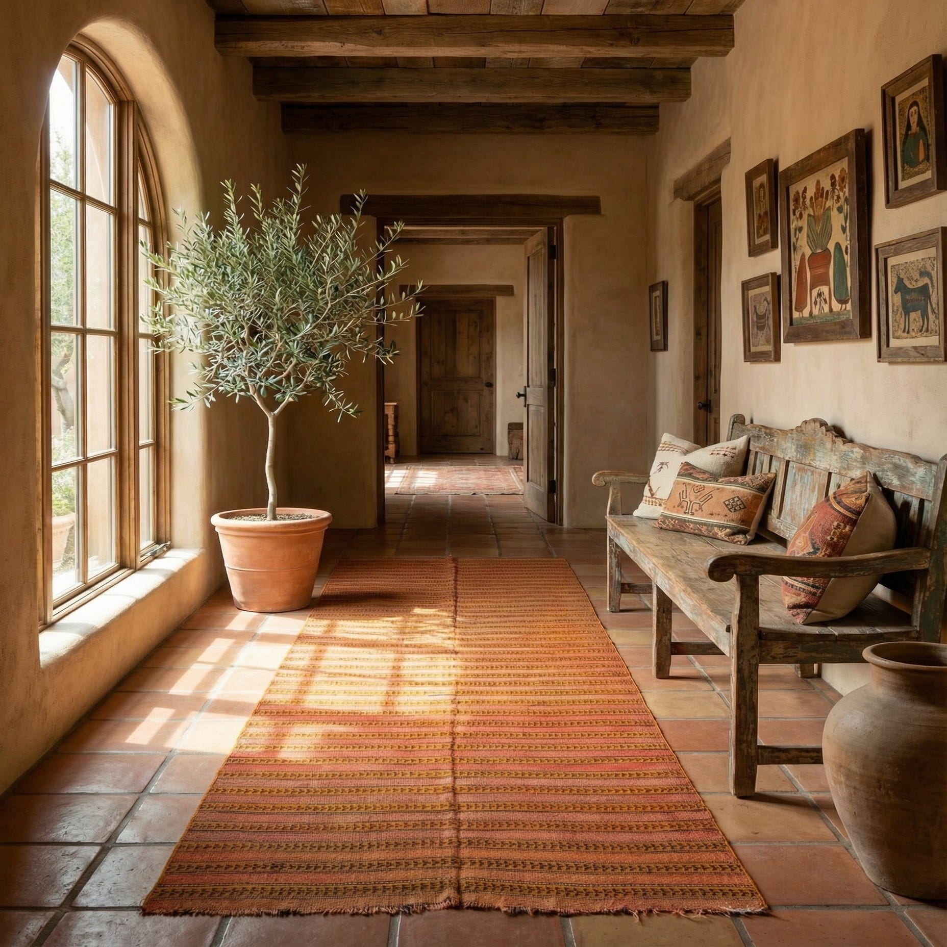 Primary color is Rust Red. Colors in this rug include: Rust Red, Black, Yellow.