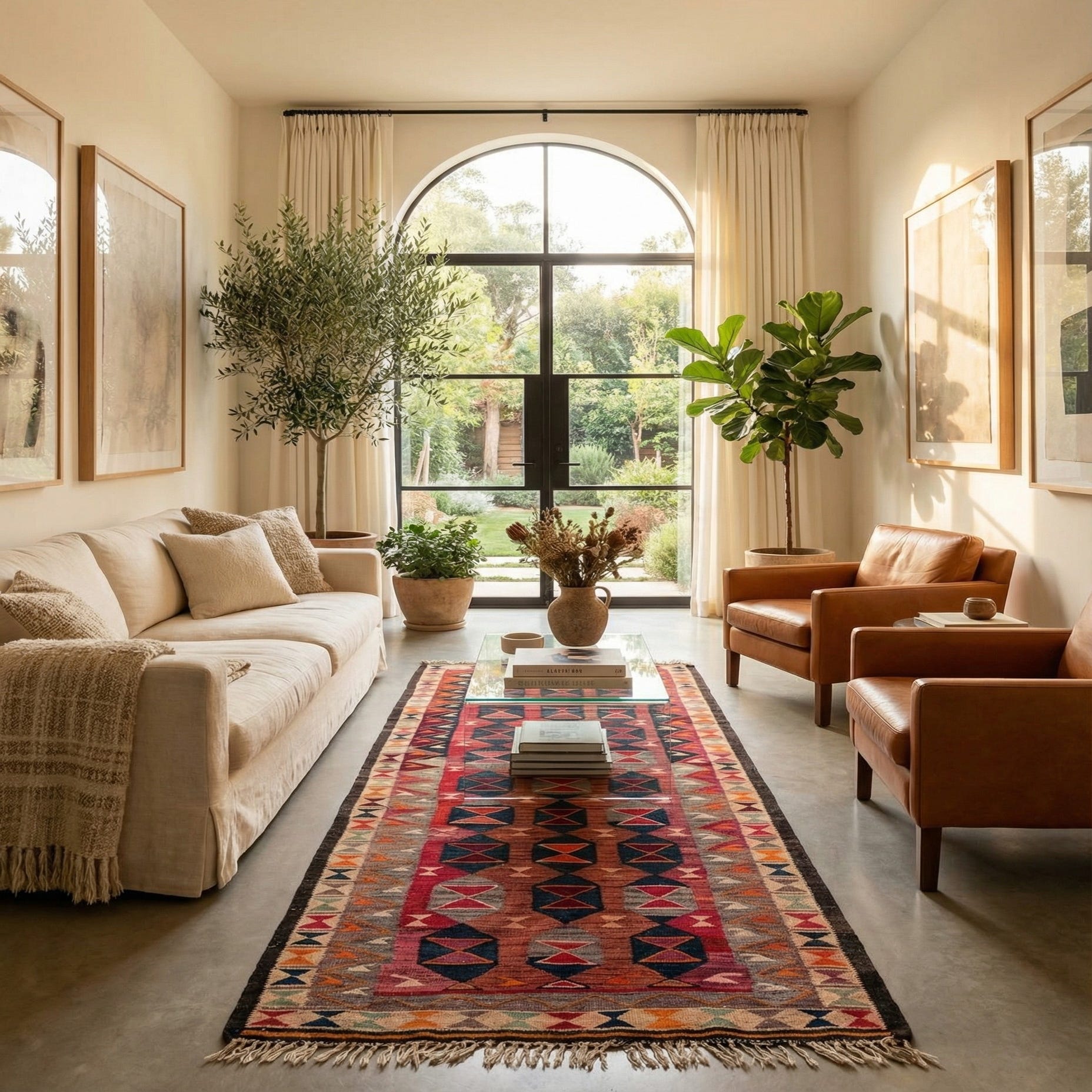 Primary color is Rust Red. Colors in this rug include: Rust Red, Brown, Ivory, Orange, Navy Blue, Violet, Black.