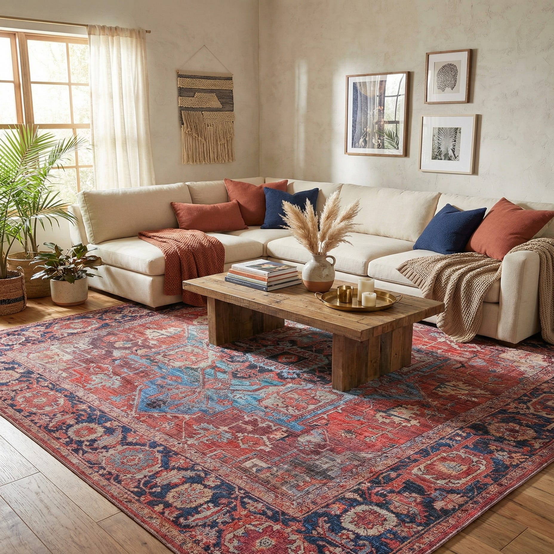 Primary color is Rust Red. Colors in this rug include: Rust Red, Blue, Gray, Navy Blue, Turquoise.