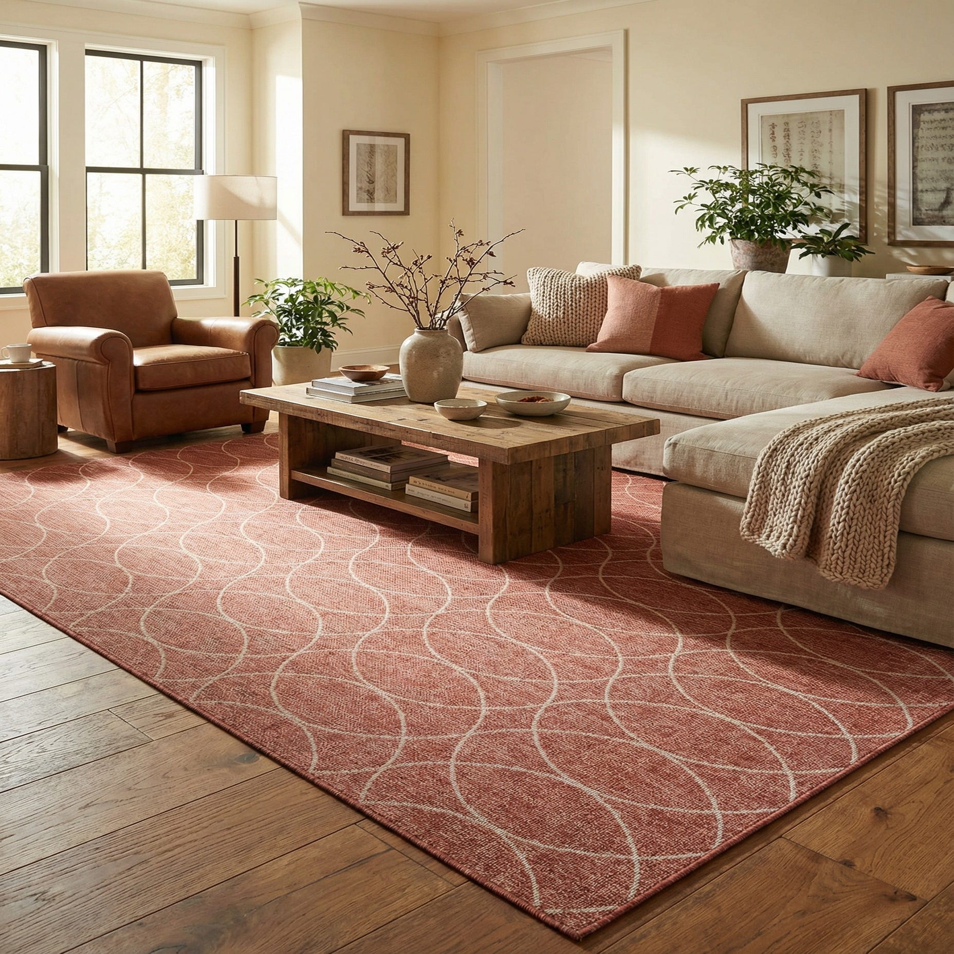 Primary color is Rust Red. Colors in this rug include: Rust Red, Ivory.