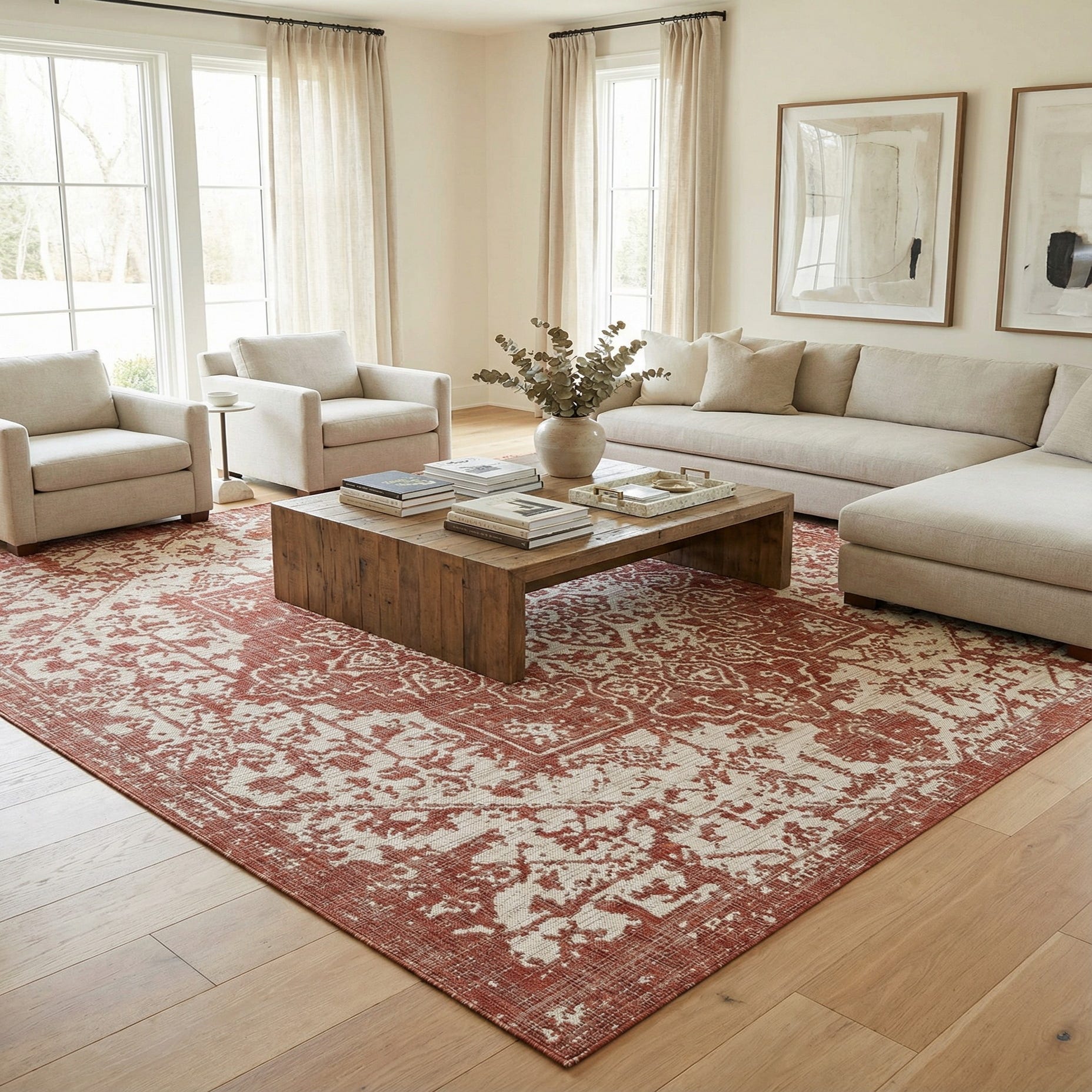 Primary color is Rust Red. Colors in this rug include: Rust Red, Ivory.
