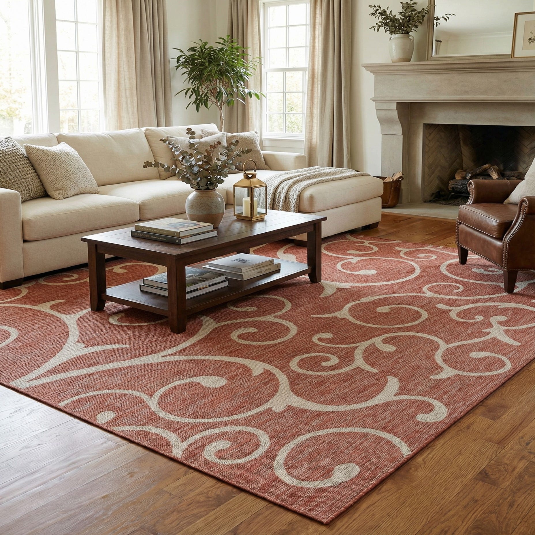 Primary color is Rust Red. Colors in this rug include: Rust Red, Ivory.