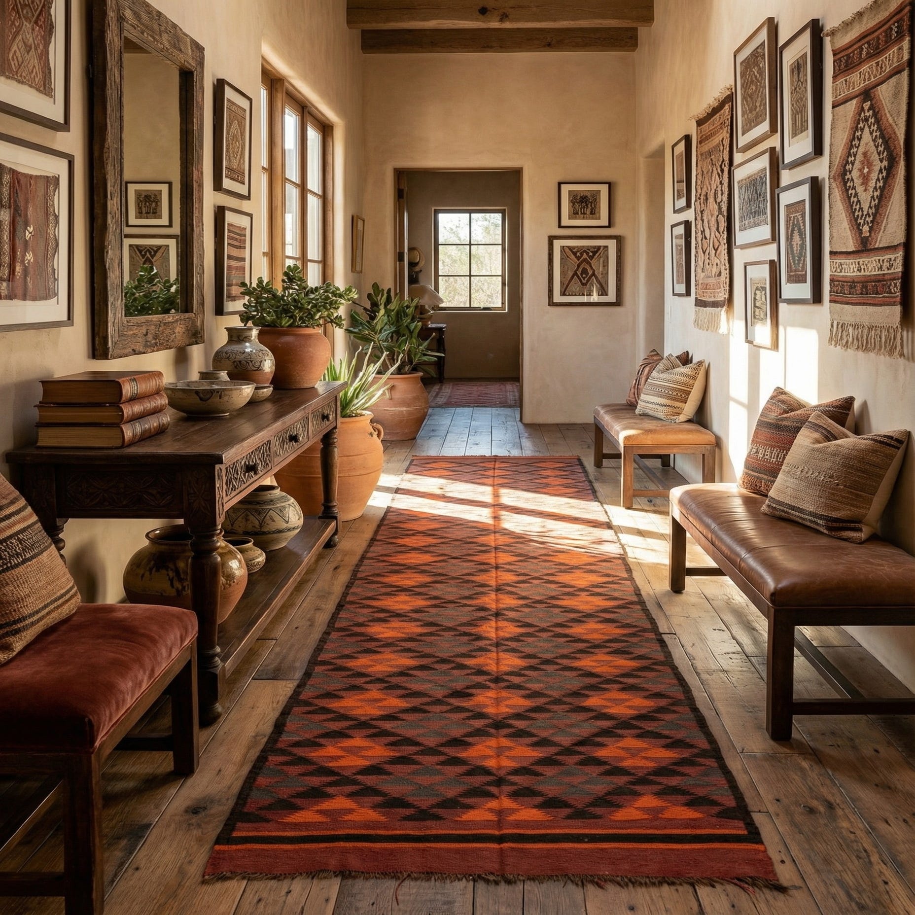 Primary color is Rust Red. Colors in this rug include: Rust Red, Brown, Orange, Black.